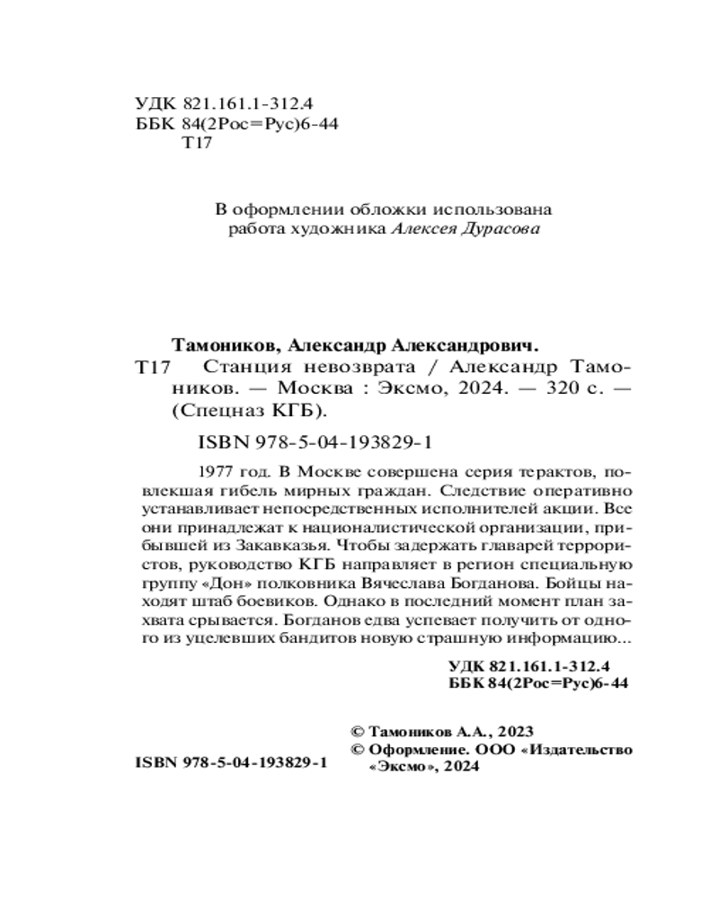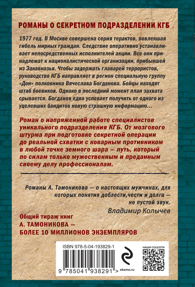 Станция невозвратаАлександр Александрович Тамоников В данный момент этот товар отсутствует в продаже. Возможно, у нас найдется аналогичный или похожий товар здесь. Серия: Спецназ КГБ (обложка) 1977 год. В Москве совершена серия терактов, повлекшая гибель мирных граждан. Следствие оперативно устанавливает непосредственных исполнителей акции. Все они принадлежат к националистической организации, прибывшей из Закавказья. Чтобы задержать главарей террористов, руководство КГБ направляет в регион специальную группу «Дон» полковника Вячеслава Богданова. Бойцы находят штаб боевиков. Однако в последний момент план захвата срывается. Богданов едва успевает получить от одного из уцелевших бандитов новую страшную информацию... |