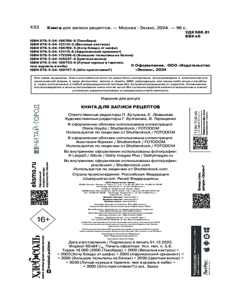 💳 Оплатить за товар можно при получении 🇰🇿 Есть бесплатная доставка по Казахстану от 1 дня 🎁 Копите бонусы с каждой покупки Серия: Кулинария. Книги для записи рецептов Красивая по оформлению, легкая по весу, доступная по цене и нужная для тех, кто любит записывать рецепты, услышанные или увиденные у родных, подруг или в интернете. Новые оформления с забавными капибарами позволят выбрать книгу для записи рецептов, наиболее понравившуюся вам, чтобы оставить для себя или подарить близким и друзьям. Готовьте с удовольствием! |