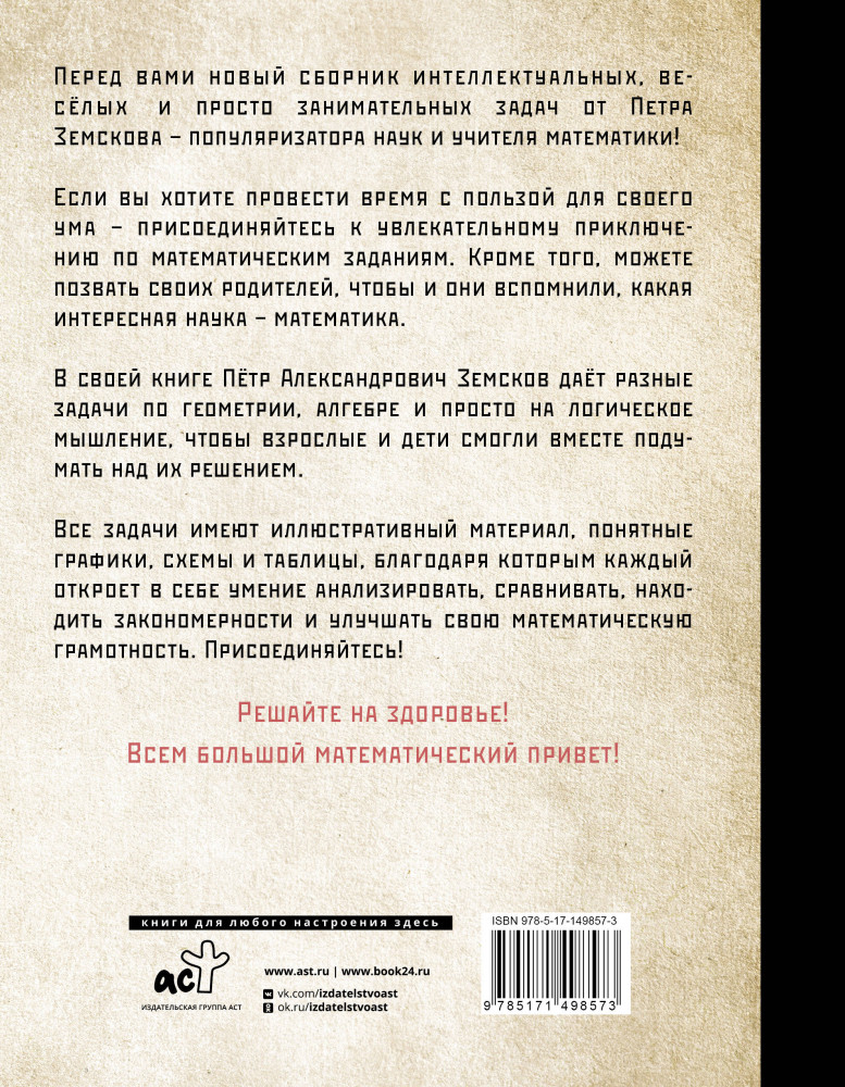 💳 Оплатить за товар можно при получении 🇰🇿 Есть бесплатная доставка по Казахстану 🎁 Копите бонусы с каждой покупки Серия: Интеллектуальные игры и головоломки Перед вами новый сборник интеллектуальных, веселых и просто занимательных задач от Петра Земскова — популяризатора наук и учителя математики! Если вы хотите провести время с пользой для своего ума — присоединяйтесь в увлекательном приключении по математическим заданиям. Кроме того, можете позвать своих родителей, чтобы и они вспомнили, какая интересная наука — математика. В своей книге Петр Александрович Земсков даёт разные задачи на геометрию, алгебру и просто логическое мышление, чтобы взрослые и дети смогли вместе подумать над их решением. |