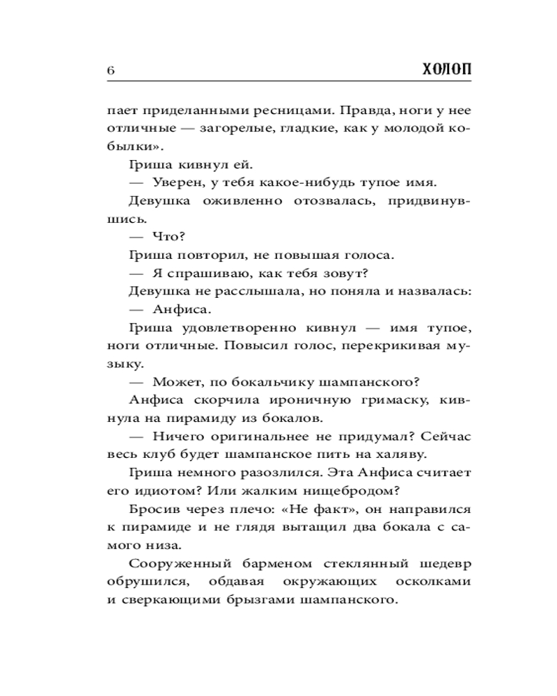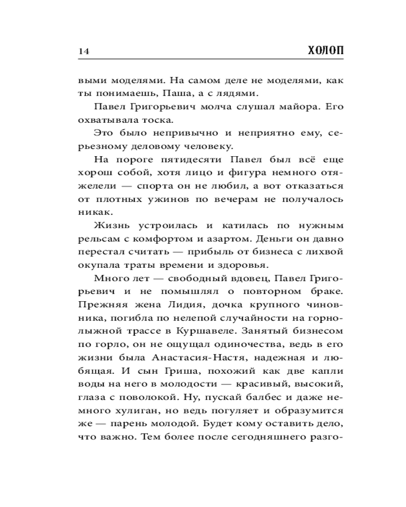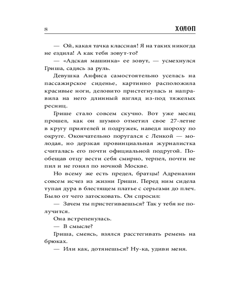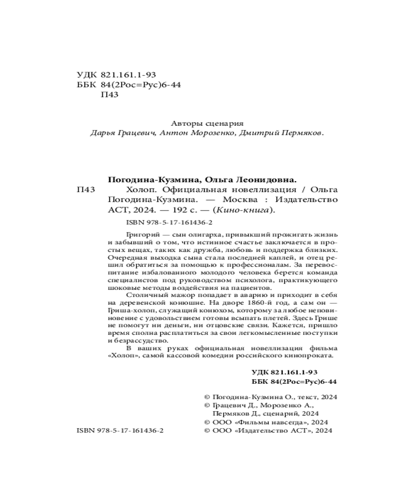 Столичный мажор попадает в аварию и приходит в себя на деревенской конюшне. На дворе 1860-й год, а сам он — Гриша-холоп, служащий конюхом, которому за любое неповиновение с удовольствием готовы всыпать плетей. Здесь Грише не помогут ни деньги, ни отцовские связи. Кажется, пришло время сполна расплатиться за свои легкомысленные поступки и безрассудство. В ваших руках официальная новеллизация фильма «Холоп», самой кассовой комедии российского кинопроката.