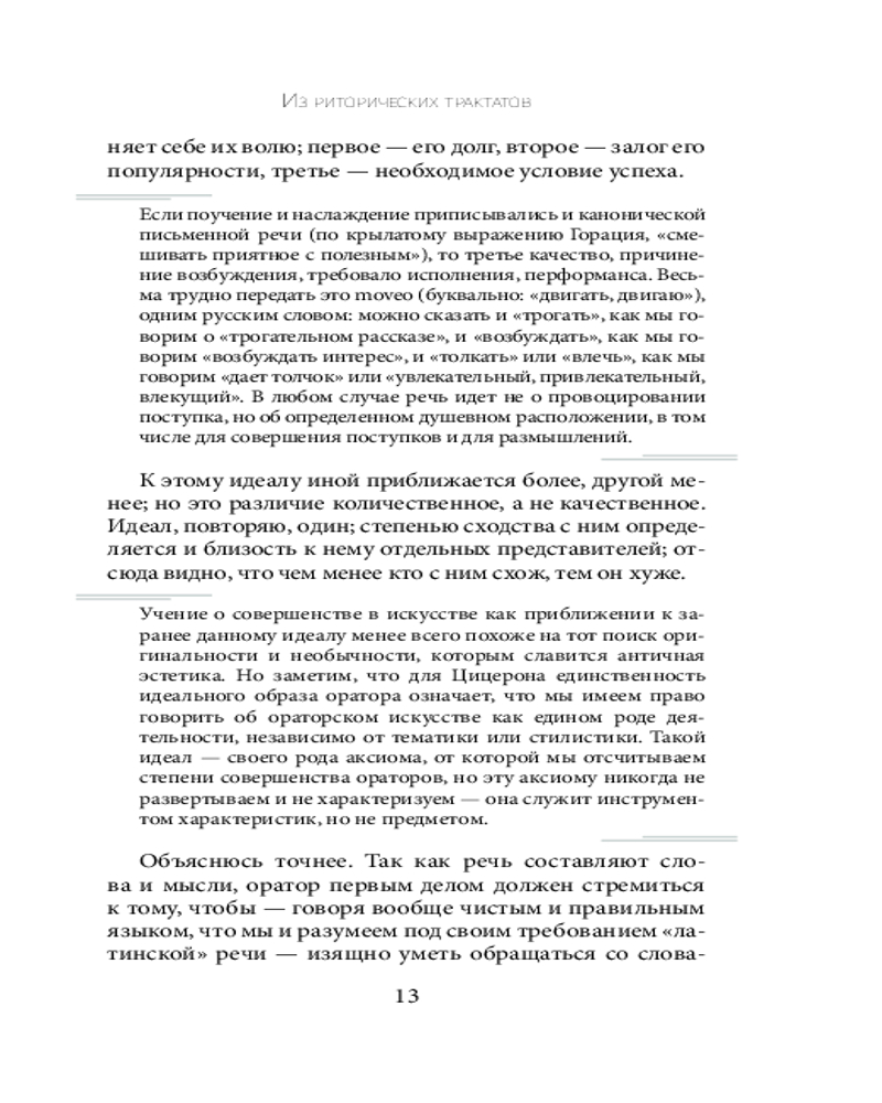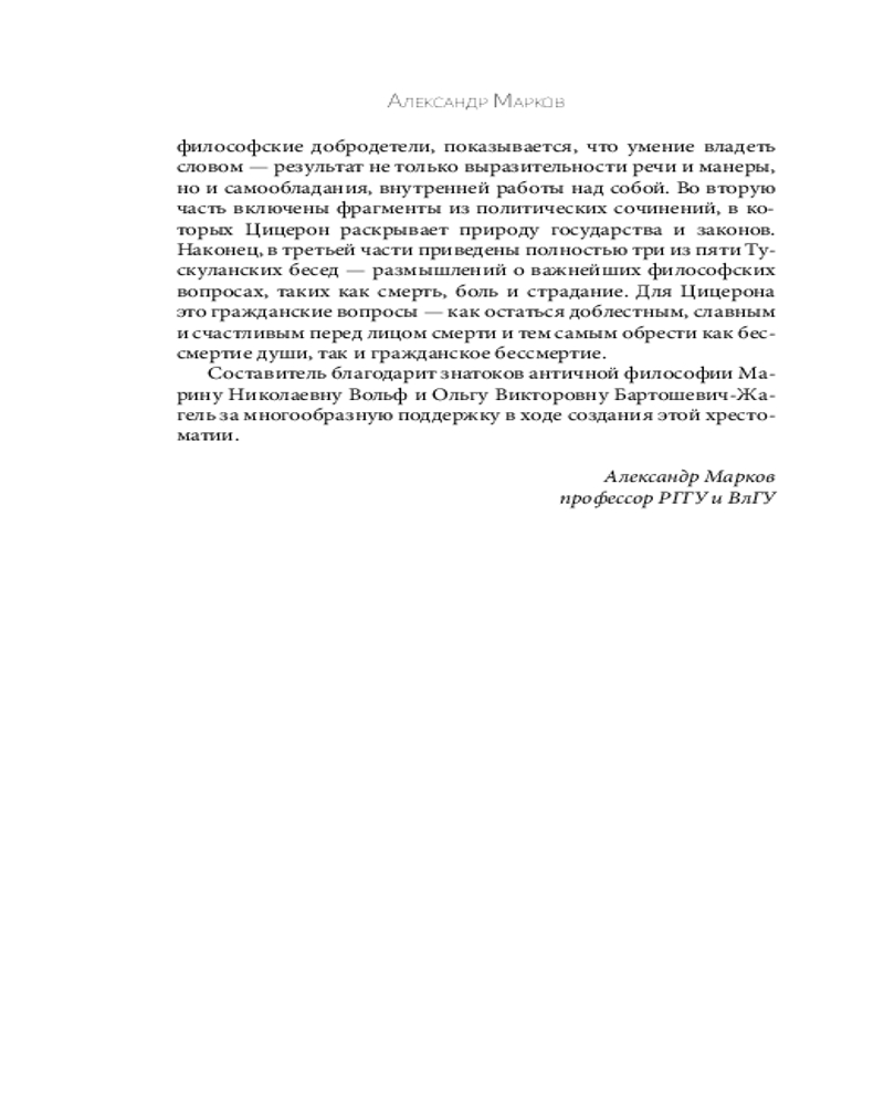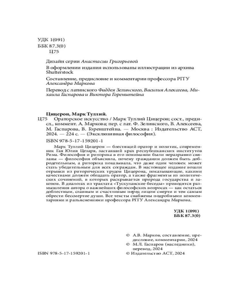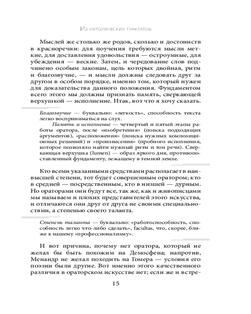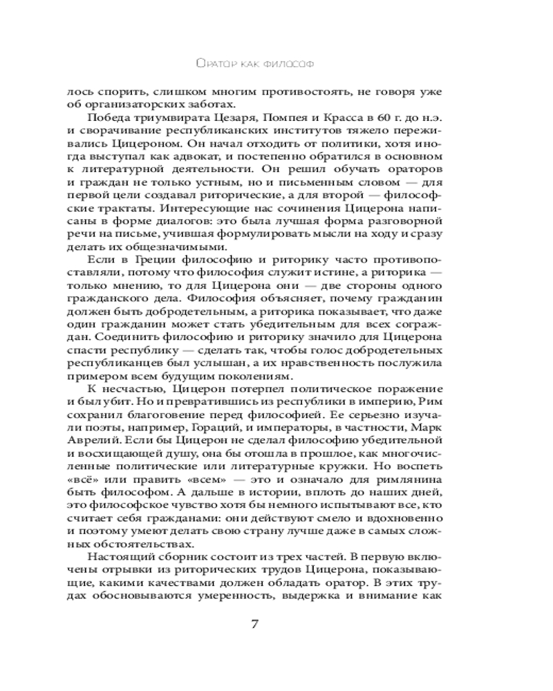Ораторское искусство. С комментариями и иллюстрациямиВ данный момент этот товар отсутствует в продаже. Возможно, у нас найдется аналогичный или похожий товар здесь. Серия: Эксклюзивная философия Марк Туллий Цицерон — блестящий оратор и политик, современник Гая Юлия Цезаря, заставший крах республиканских институтов Рима. Философия и риторика в его понимании были неразрывно связаны — философия объясняла, почему гражданин должен быть добродетельным, а риторика показывала, что даже один гражданин может стать убедительным для всех сограждан. В новую книгу серии «Популярная философия» вошли отрывки из риторических трудов Цицерона, показывающие, какими качествами должен обладать оратор, а также фрагменты из политических сочинений, в которых раскрывается природа государства и законов. В третьей части приведены три из пяти Тускуланских бесед, содержащие размышления о важнейших философских вопросах — как остаться доблестным, славным и счастливым перед лицом смерти и тем самым обрести бессмертие души и гражданское бессмертие. Все тексты снабжены подробными комментариями и разъяснениями профессора РГГУ Александра Маркова. |
