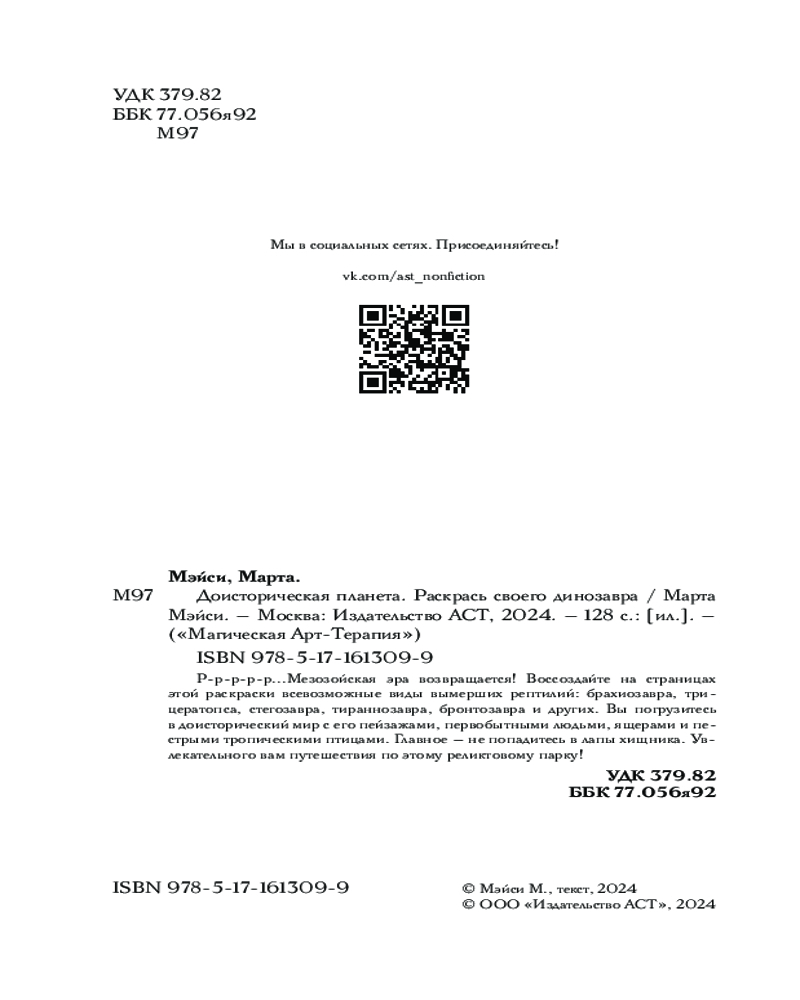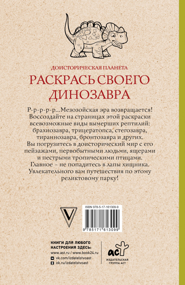 Раскрась своего динозавра. Доисторическая планетаВ данный момент этот товар отсутствует в продаже. Возможно, у нас найдется аналогичный или похожий товар здесь. Серия: Магическая Арт-Терапия Р-р-р-р-р...Мезозойская эра возвращается! Воссоздайте на страницах этой раскраски всевозможные виды вымерших рептилий: брахиозавра, трицератопса, стегозавра, тираннозавра, бронтозавра и других. Вы погрузитесь в доисторический мир с его пейзажами, первобытными людьми, ящерами и пестрыми тропическими птицами. Главное — не попадитесь в лапы хищника. Увлекательного вам путешествия по этому реликтовому парку! |