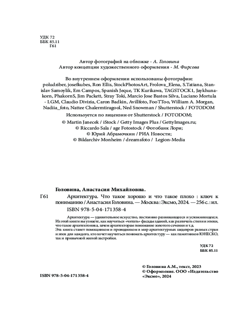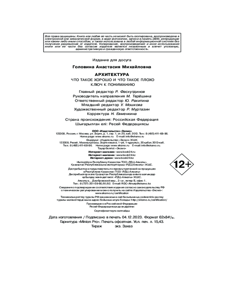 Серия: Глазами инженера. Учим читать архитектуру Книга «Архитектура. Что такое хорошо и что такое плохо» Анастасии Головиной — это четкое и лаконичное руководство к пониманию архитектуры. Эта книга будет идеальным подарком для каждого, кто хочет разобраться в архитектуре, научиться ее чувствовать и понимать. Красочные иллюстрации и уникальные видеозаписи лекций автора, эксклюзивно доступные по QR-кодам внутри книги, сделают изучение архитектуры незабываемым!