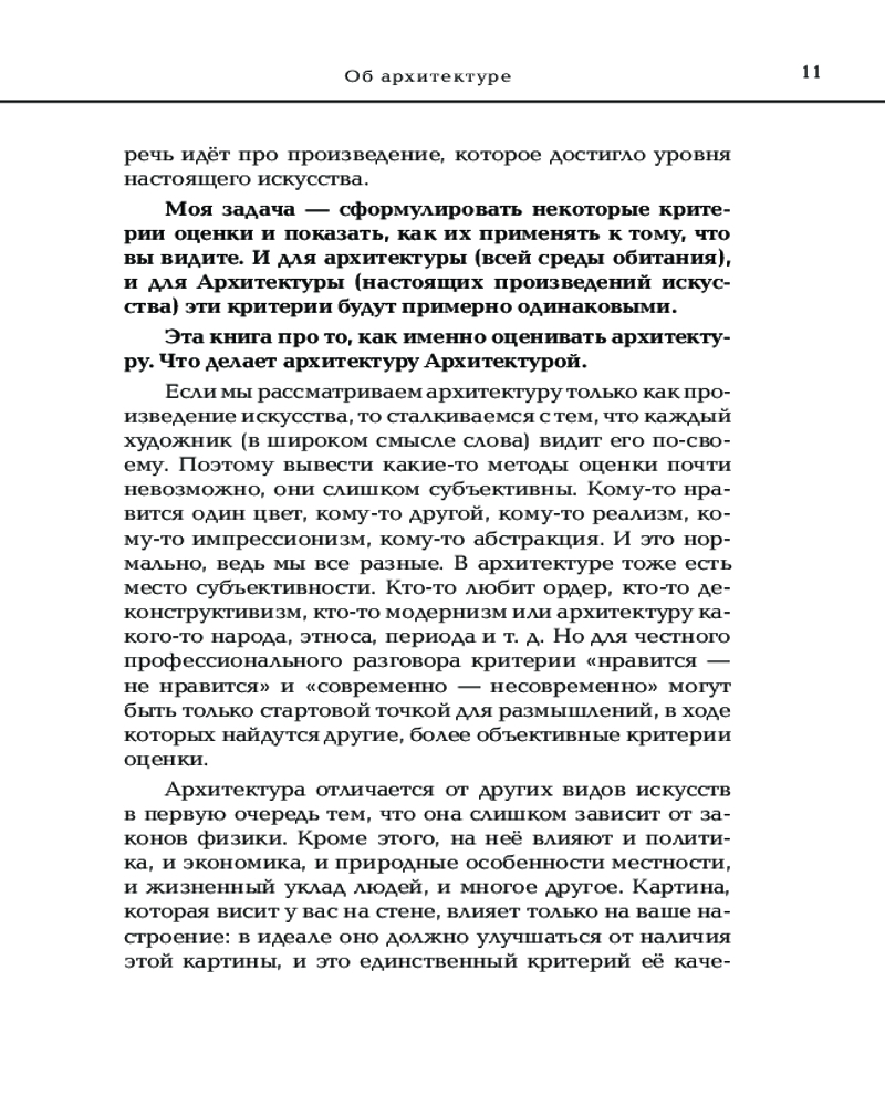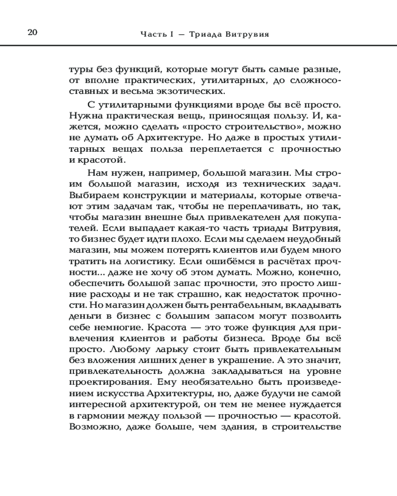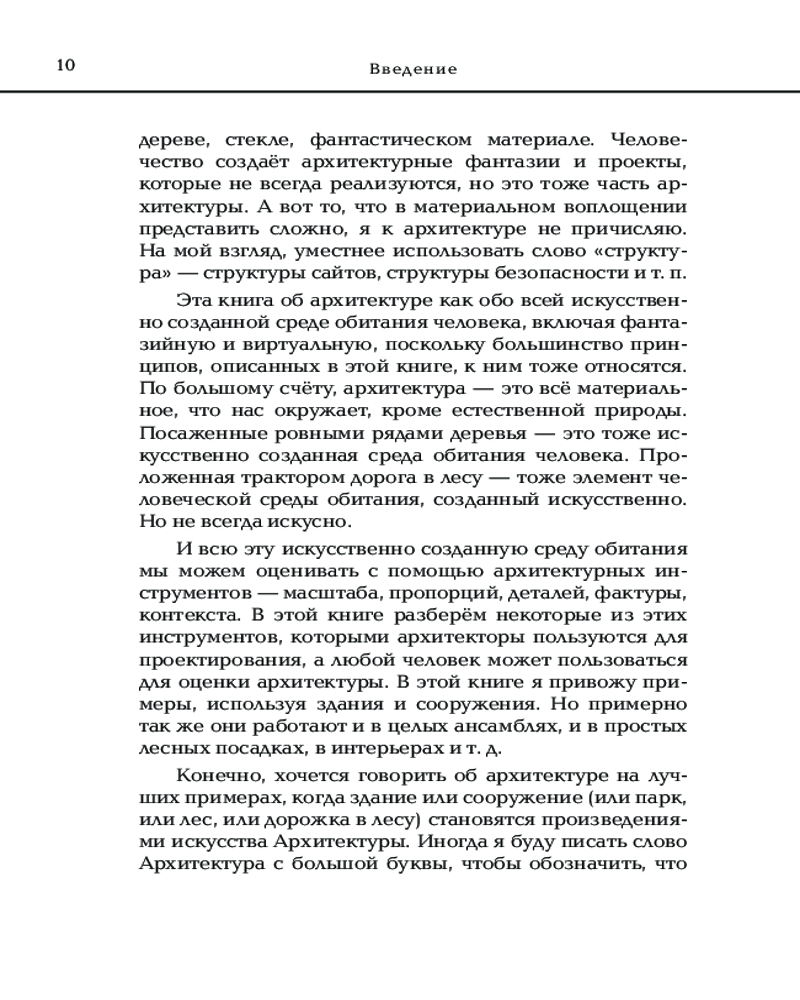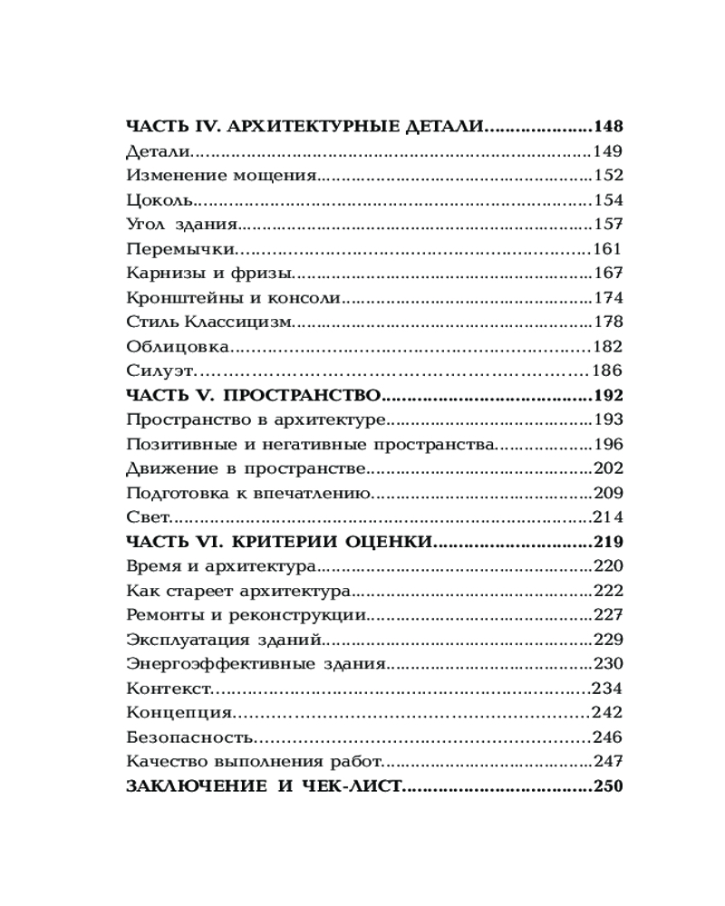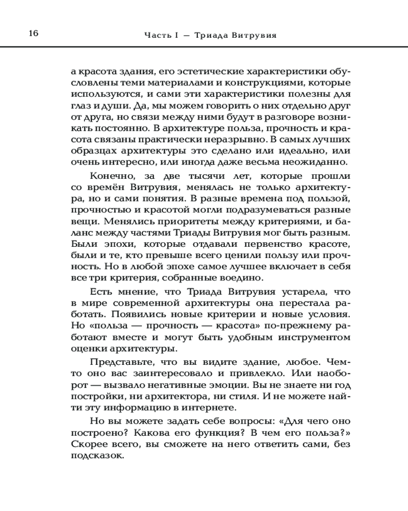 Автор анализирует определение архитектуры, введенное римским архитектором Витрувием, которое включает пользу, прочность и красоту. Головина анализирует эту концепцию и проводит параллели с современным миром, демонстрируя, как эти три аспекта касаются современной архитектуры. Также она рассматривает различные аспекты визуального выражения зданий, включая гармонию, пропорции, симметрию и цвет, то, как архитектура может быть связана с другими видами искусства. Отдельная часть книги посвящена архитектурным деталям. Автор рассматривает различные элементы зданий, включая двери, окна, углы, перемычки, карнизы и многое другое. Она анализирует, какие роли эти элементы играют в создании общего силуэта здания. Автор демонстрирует, как пространство влияет на архитектуру, и, наоборот, какие есть психологические эффекты взаимодействия людей с пространством.