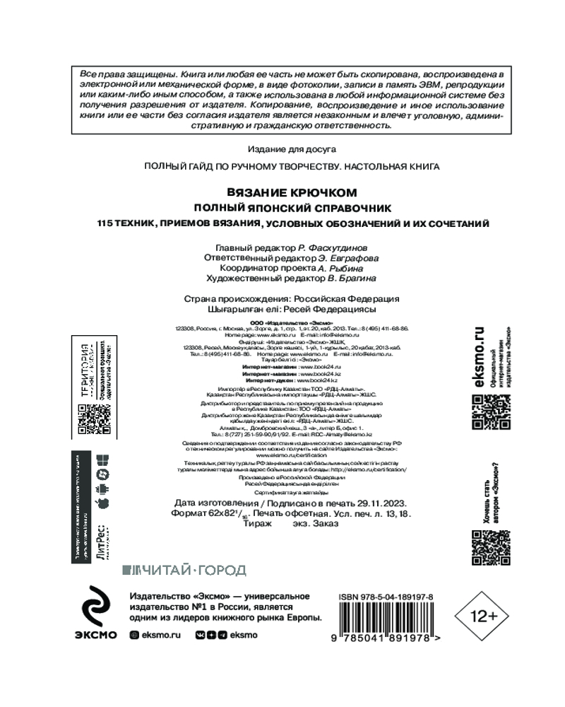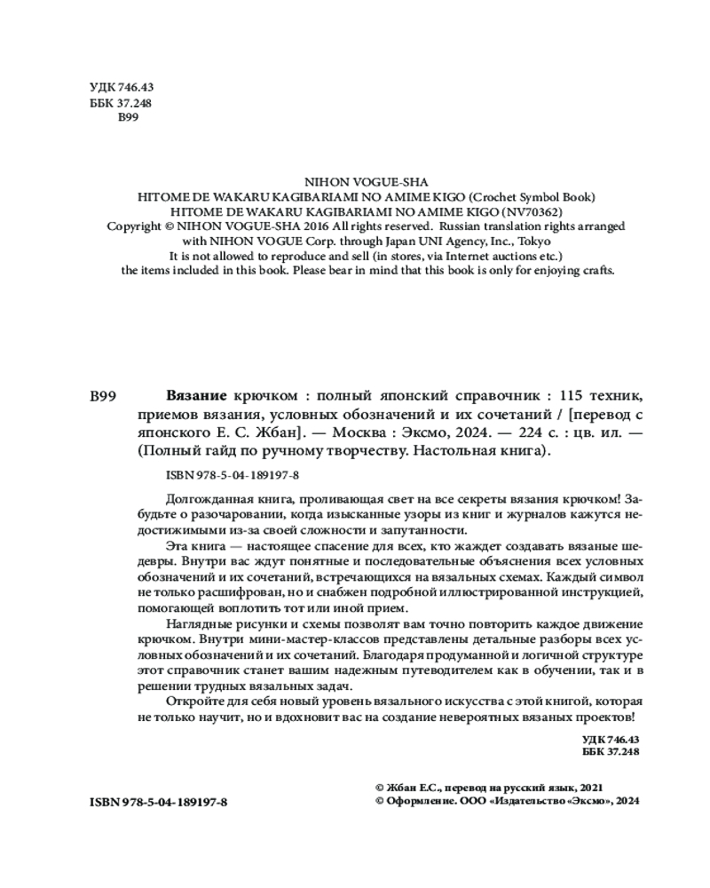 Вязание крючком. Полный японский справочник. 115 техник, приёмов вязания, условных обозначений и их сочетанийхорошая книга полезная полезный справочник ожидания В данный момент этот товар отсутствует в продаже. Возможно, у нас найдется аналогичный или похожий товар здесь. Серия: Полный гайд по ручному творчеству. Настольная книга Моментальный ответ на любой вопрос по вязанию крючком! Верный помощник и советчик: уникальный мини-гид по чтению вязальных схем и технологии вязания! С этим удивительным гидом вы разгадаете все тайны условных обозначений и их сочетаний, встречающихся в книгах с узорами. Кратко, четко, наглядно! Каждый шаг представлен логично и последовательно, а сопровождающие иллюстрации помогут вам мастерски выполнять каждый прием. Теперь даже самые сложные схемы будут доступны для расшифровки, и вы сможете с легкостью воплотить в жизнь даже самые запутанные узоры, создавая настоящие шедевры вязального искусства! |