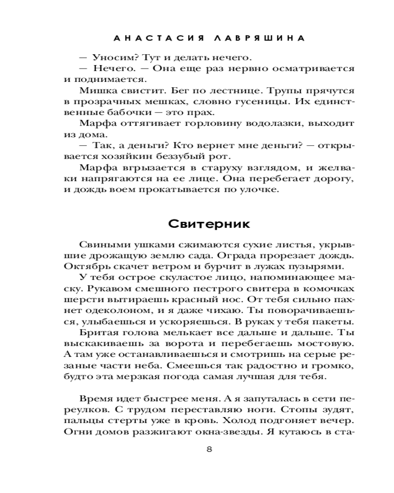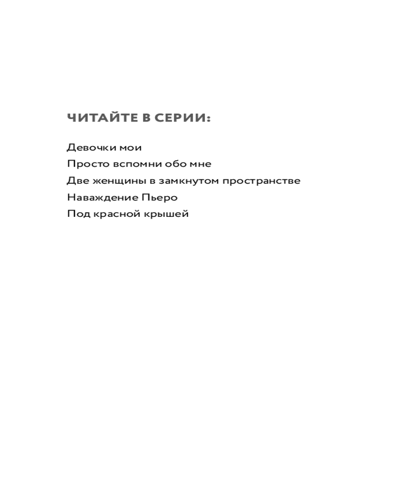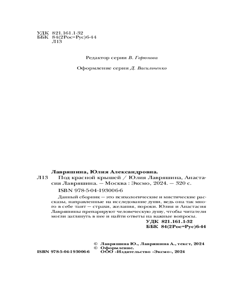 Под красной крышейЮлия Александровна Лавряшина, Анастасия Артуровна Лавряшина В данный момент этот товар отсутствует в продаже. Возможно, у нас найдется аналогичный или похожий товар здесь. Серия: Девочки мои. Психологические романы Ю. Лавряшиной Данный сборник — это психологические и мистические рассказы, направленные на исследование души, ведь она так много в себе таит — страхи, желания, пороки. Юлия и Анастасия Лавряшины препарируют человеческую душу, чтобы читатели могли заглянуть в нее и найти ответы на важные вопросы. |