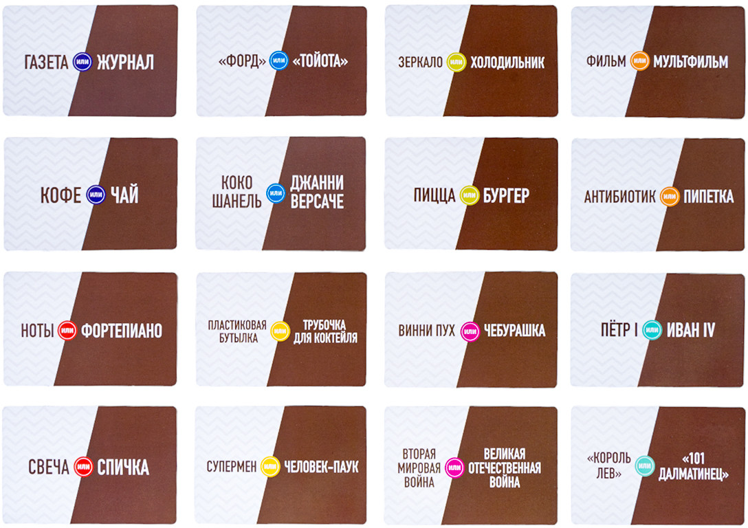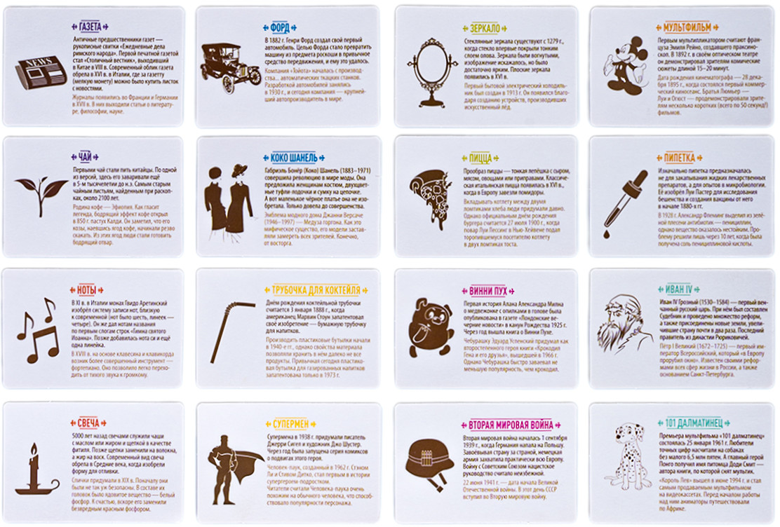 • тот, кто ходит первым, зачитывает с верхней карты названия сопоставляемых предметов и предлагает свой ответ — что было раньше;