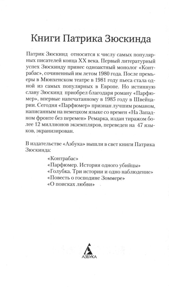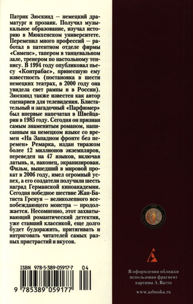 💳 Оплатить за товар можно при получении 🇰🇿 Есть бесплатная доставка по Казахстану от 1 дня 🎁 Копите бонусы с каждой покупки Серия: Классика (мяг) Блистательный и загадочный «Парфюмер» Патрика Зюскинда был впервые напечатан в Швейцарии в 1985 году. Сегодня он признан самым знаменитым романом, написанным на немецком языке со времен «На Западном фронте без перемен» Ремарка, издан тиражом более 12 миллионов экземпляров, включая латынь, и, наконец, экранизирован. Фильм, вышедший в мировой прокат в 2006 году, имел огромный успех, а его создатели получили шесть наград Германской киноакадемии. Сегодня победное шествие Жан-Батиста Гренуя — великолепного всепобеждающего монстра — продолжается. Несомненно, этот захватывающий романтический детектив, уже ставший классикой, еще долго будет будоражить, притягивать и интриговать читателей самых разных пристрастий и вкусов. |