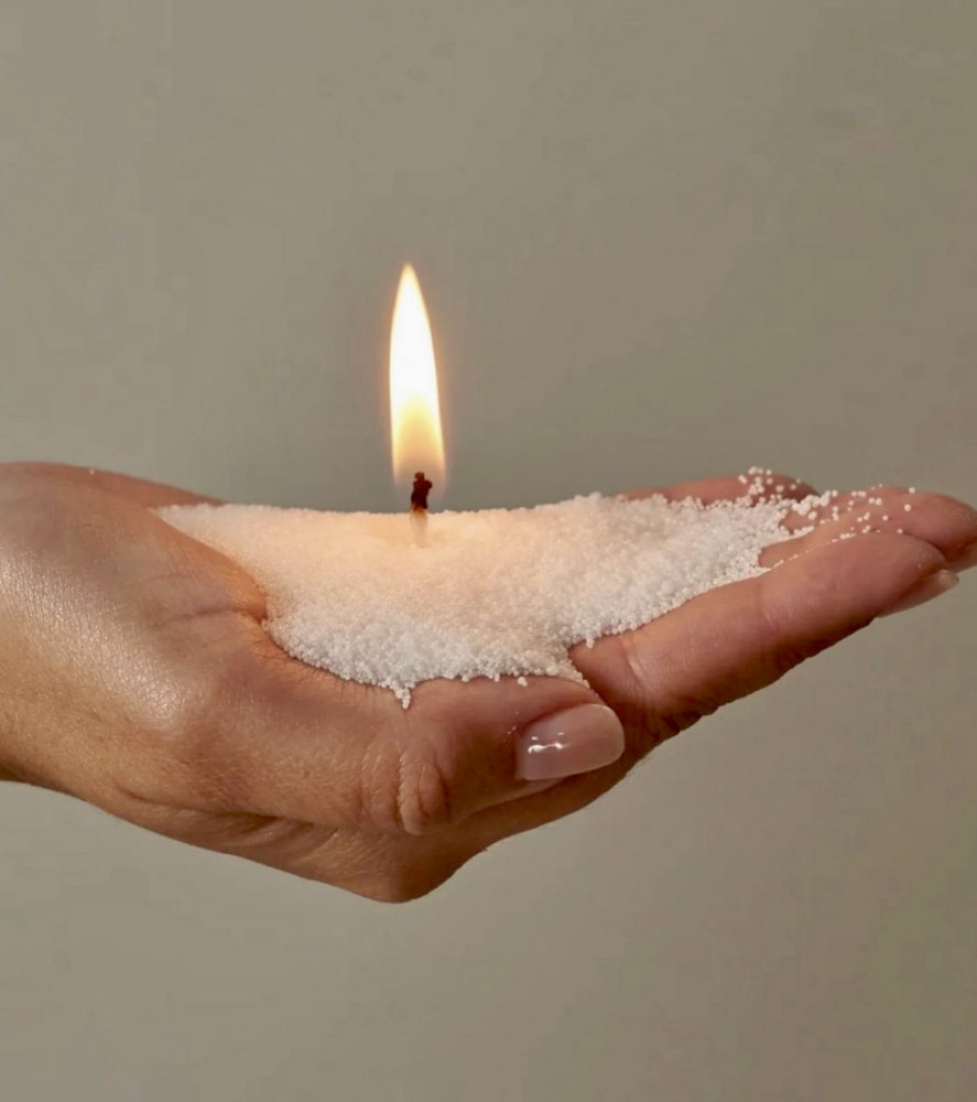 Пакет, хоть и бумажный, но очень прочный. Сам воск состоит из очень мелких белых шариков с лёгким и отчётливым, немного специфическим запахом, который при горении исчезает. К пакету прилагается три фитиля длиной 20 см в прозрачном слюдяном пакетике. Конечно, фитилей может не хватить на этот объем, но их можно купить или сделать... Воск я насыпаю в стаканчик из-под использованной ароматической свечи, который не выбросила. Воска остаётся немного на стенках и на дне. Верхний слой расплавленный, а под ним шарики. Я его отделяю, измельчаю кусочки, чтобы не были крупными, досыпаю воск из пакета на своё усмотрение и зажигаю новую свечу. Очень удобно! Мне понравилось использовать насыпные свечи. Однозначно буду брать ещё!