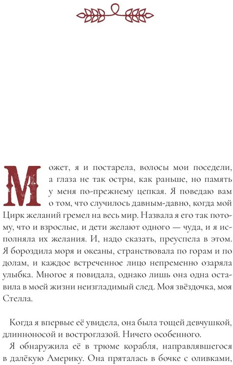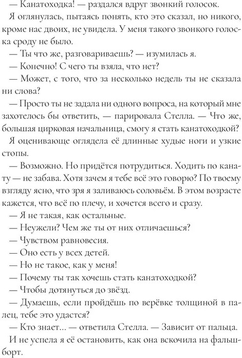Хозяйка странствующего цирка привыкла дарить чудеса маленьким и взрослым, властителям и беднякам. Но лишь однажды чудо приходит в ее собственную жизнь — несносная проказница Стелла, наполовину девочка, наполовину звезда, которая мечтает стать канатоходкой... И что теперь с ней делать? Стелла — тощая востроглазая девчушка. Она бороздит моря и океаны на корабле, спрятавшись в бочке с оливками. Однажды в трюме ее обнаружила хозяйка самого знаменитого в мире цирка, женщина суровая на вид, но добрая в душе. Эта встреча оставит неизгладимый след в жизни обеих. |