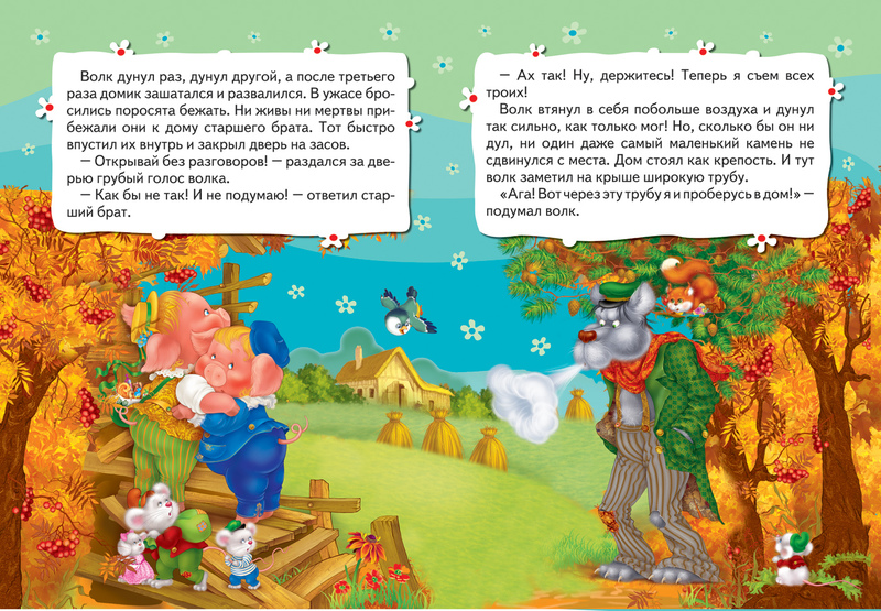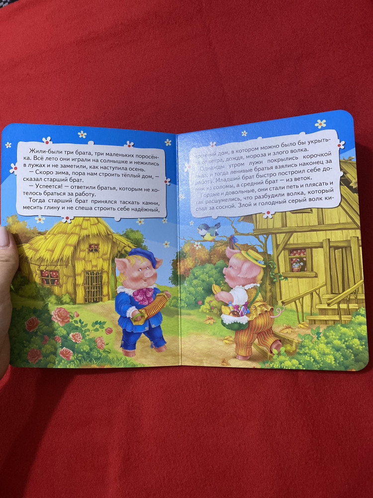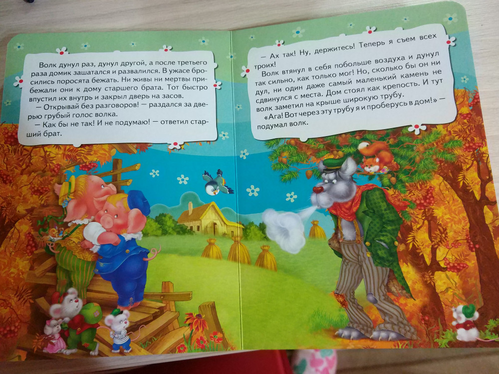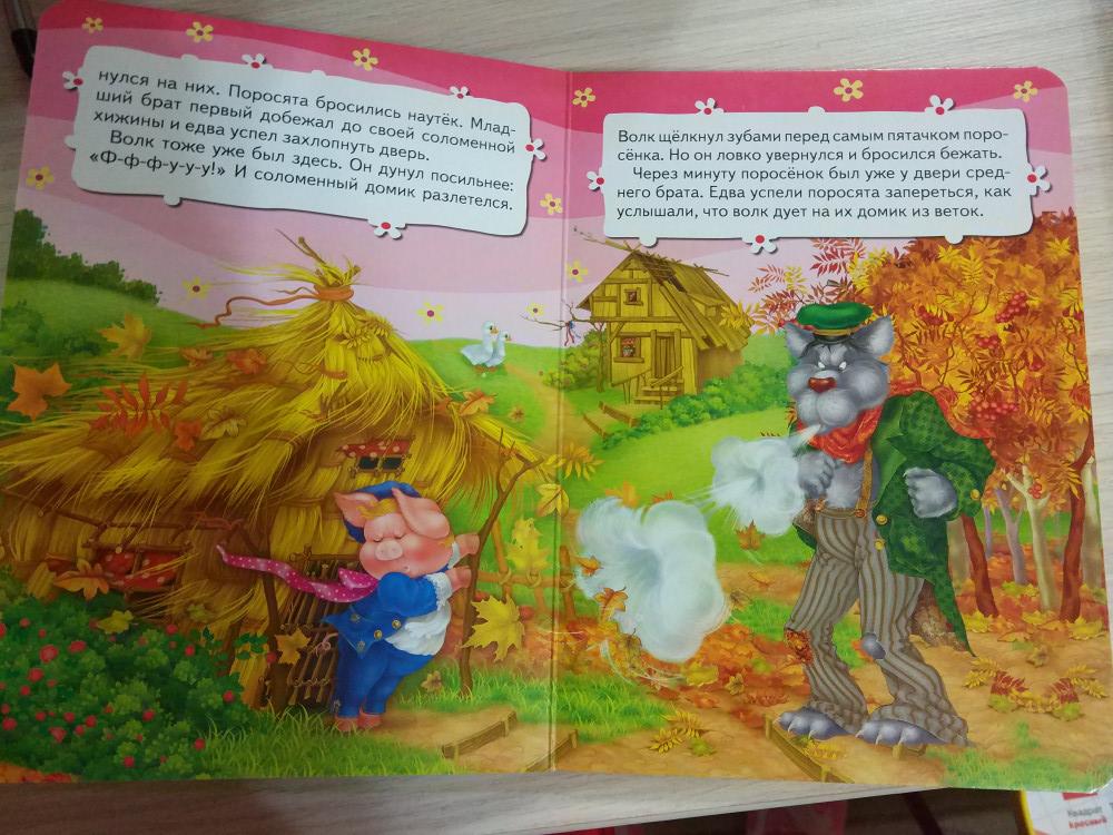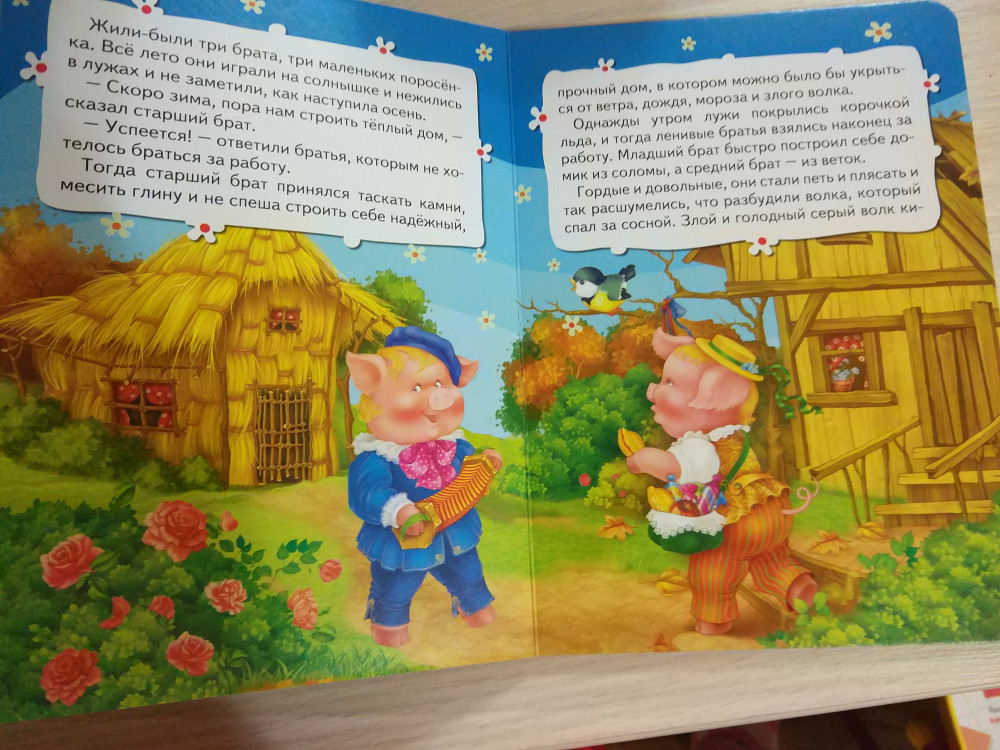 Качественная полиграфия, плотный картон, яркие иллюстрации. Согласна с предыдущим мнением, поросята, откровенно, некрасивые (хотя остальная часть иллюстраций неплохая). Но в этой серии, есть несколько книг, у которых картинки так себе. В остальном, серия книг "всё - всё - всё для малышей" просто замечательная.