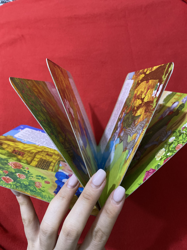 Отличная книжка для малыша! Листы картонные, плотные, красочные, яркие, рисунки интересные, сказки кратки и доступные! Ребенок спокойно может играть с книжкой, при этом не порвав и не смяв ее!