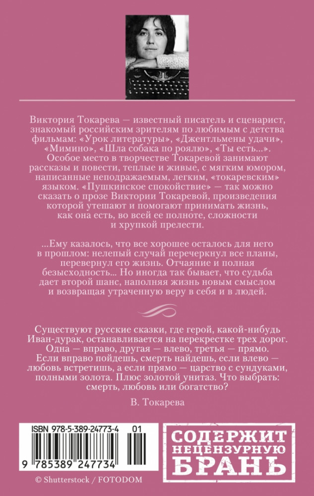 💳 Оплатить за товар можно при получении 🇰🇿 Есть бесплатная доставка по Казахстану от 1 дня 🎁 Копите бонусы с каждой покупки Серия: Виктория Токарева. Новое оформление Виктория Токарева — известный писатель и сценарист, знакомый российским зрителям по любимым с детства фильмам: «Урок литературы», «Джентльмены удачи», «Мимино», «Шла собака по роялю», «Ты есть...». Особое место в творчестве Токаревой занимают рассказы и повести, теплые и живые, с мягким юмором, написанные неподражаемым, легким, «токаревским» языком. С симпатичными героями, которые порой напоминают нас самих. «Пушкинское спокойствие» — так можно сказать о прозе Виктории Токаревой, произведения которой утешают и помогают принимать жизнь, как она есть, во всей ее полноте, сложности и хрупкой прелести. |