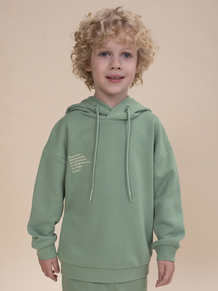 Изделие выполнено в однотонном зеленом цвете. Худи спереди декорировано принтом: «Be present, listen to music, be with you BF, do things that make you happy #enjoy!» — перевод: «Живи в моменте, слушай музыку, встречайся со своим лучшим другом, делай то, что делает тебя счастливым #наслаждайся!». На спинке надпись: «Feeling good always trendy» — «Хорошее настроение всегда в тренде (модно)». Толстовка оверсайз рассчитана на возраст садика и школы. Понравится малышам, школьникам и подросткам.