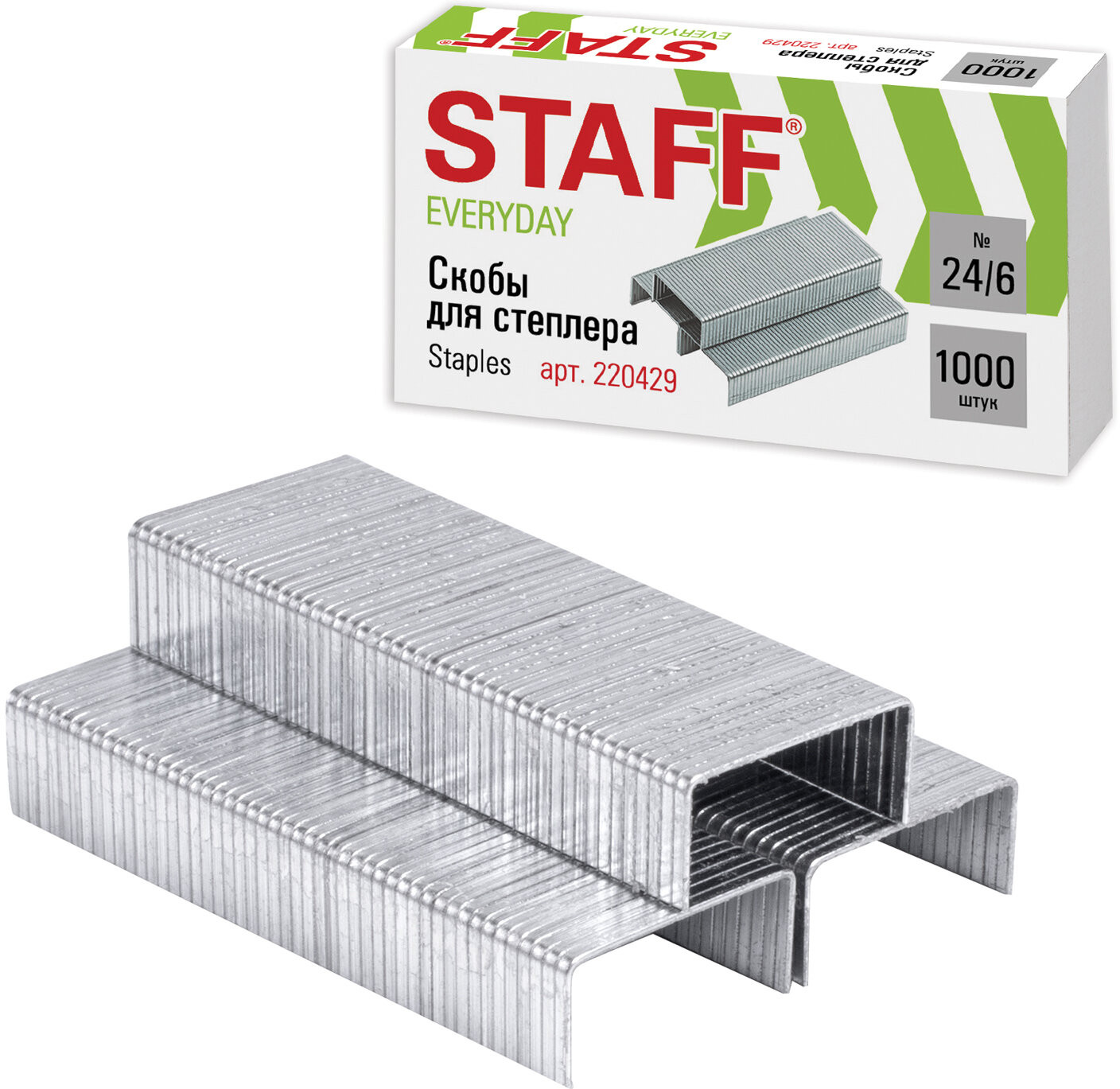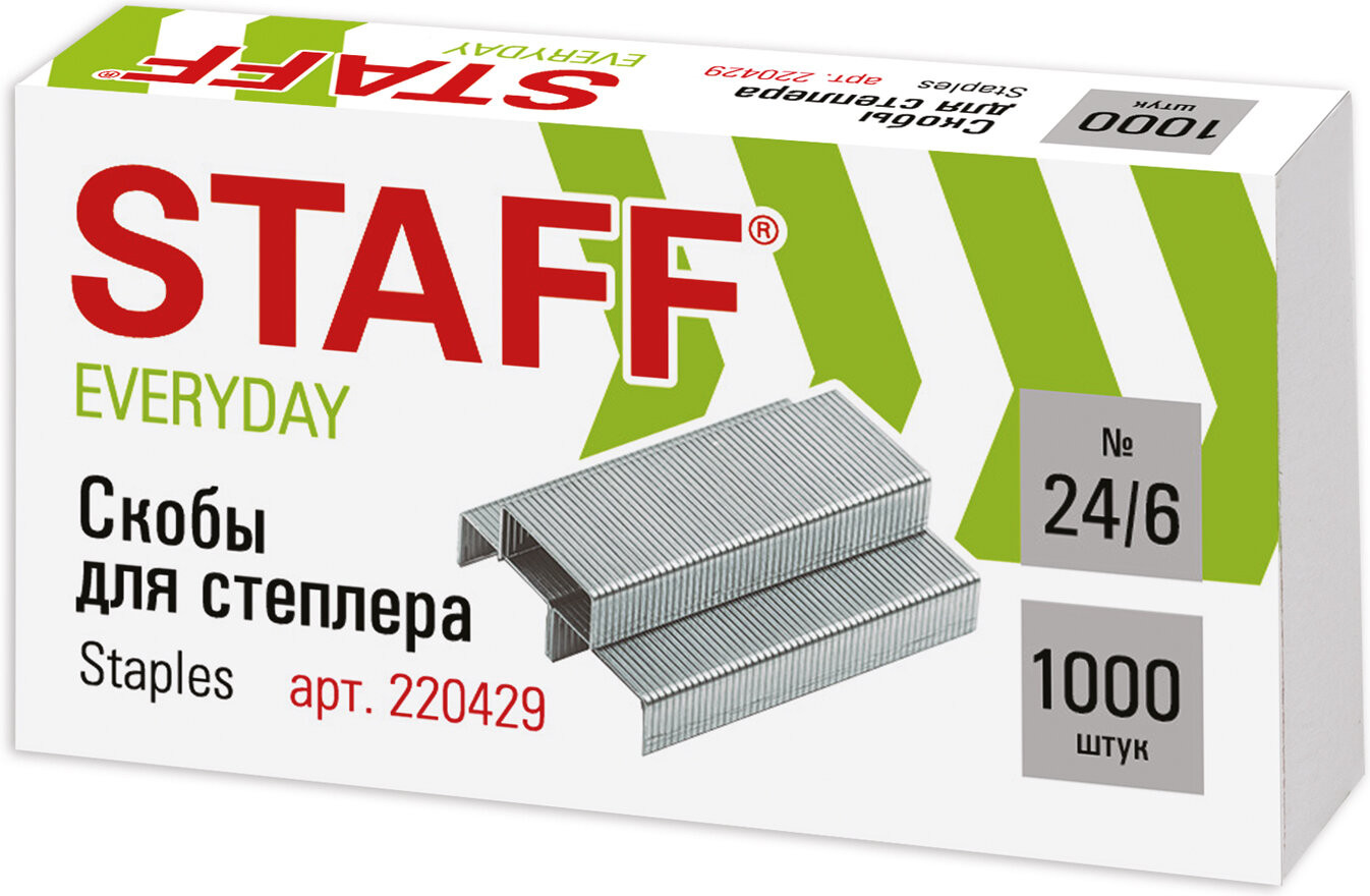 Staff Скобы для степлераВ данный момент этот товар отсутствует в продаже. Возможно, у нас найдется аналогичный или похожий товар здесь. Стальные скобы серебристого цвета для степлера STAFF «Everyday» размером № 24/6. |