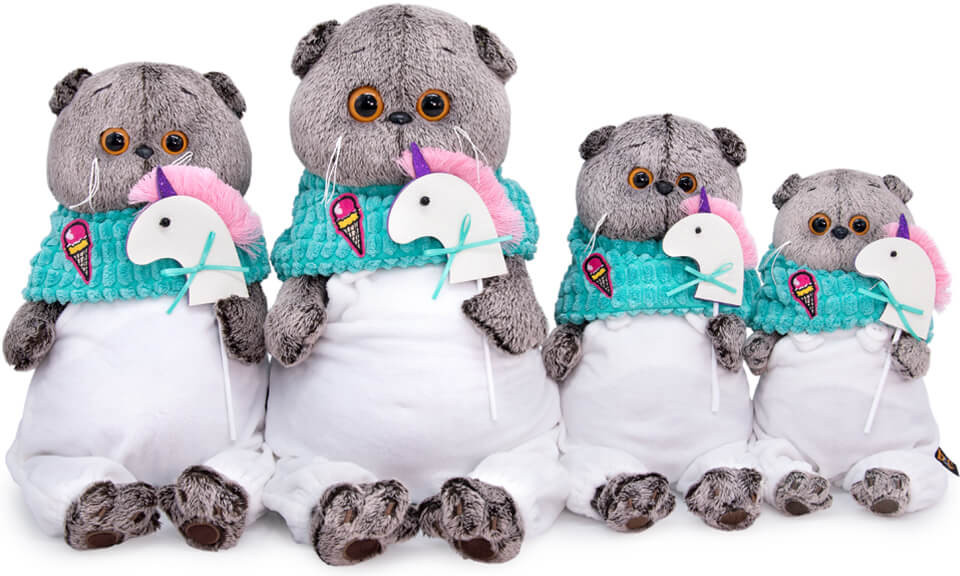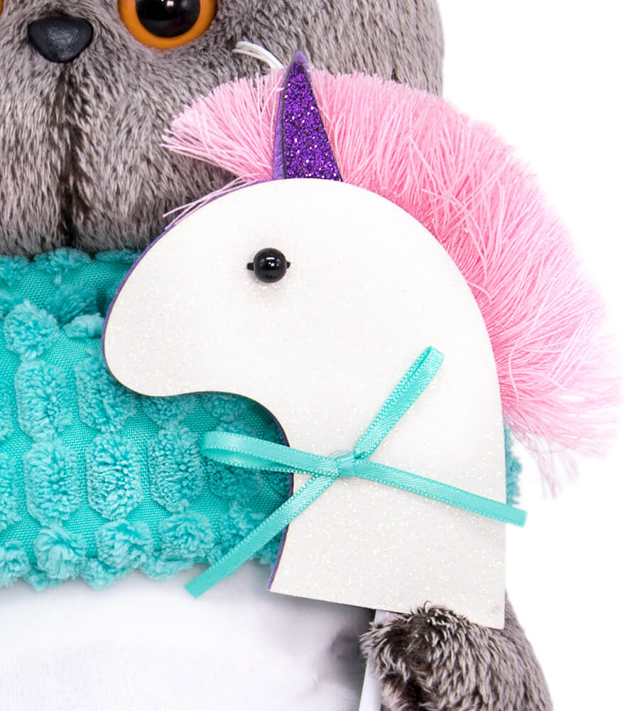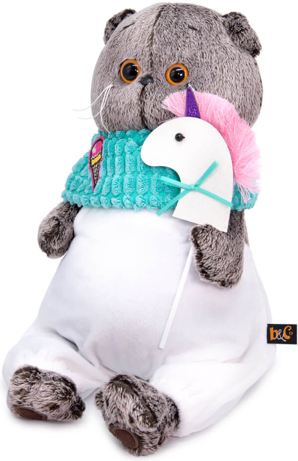 Кот в комбинезоне из белоснежного софта и снуде из бирюзового крупноячеистого вельвета. Снуд украшен нашивкой в виде мороженого. В лапках Басик держит единорога на палочке, выполненного вручную из фетра с атласным бантиком.