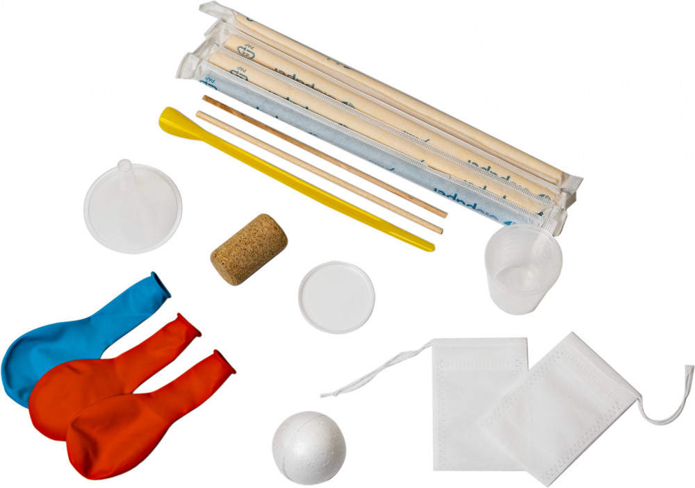 В набор входят: обучающий буклет, мерный стакан с крышкой, цилиндрический корпус ракеты, ракетная конструкция, наклейки, мешочек, сода пищевая, лимонная кислота, воронка, мензурка, пробка, пластиковая лопатка, воздушные шарики, карточка планетохода, деревянные палочки, бумажный стакан, пенопластовый шар, соломинки. |