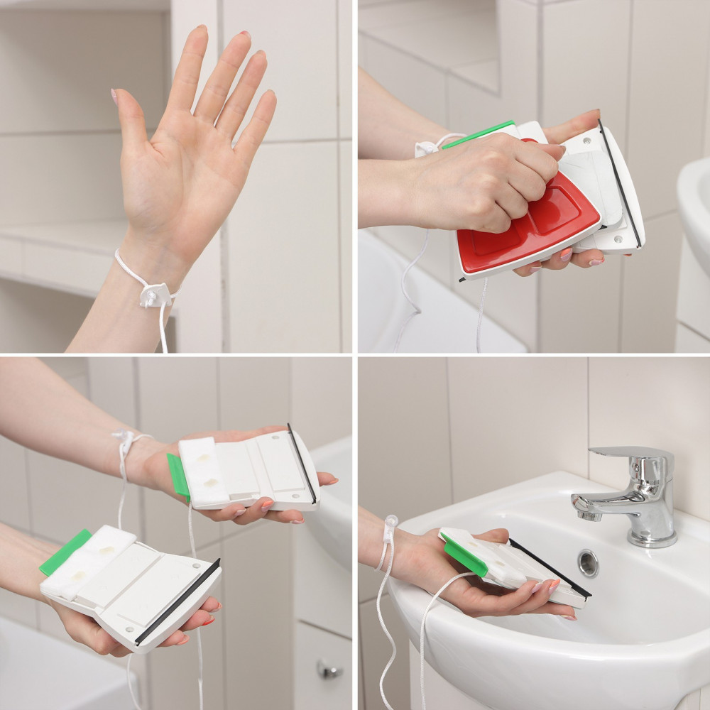 Применение: намочите и нанесите моющее средство на щётку. Наденьте на запястье страховочный шнур, он защитит прибор от падений и выскальзывания. Приложите две части изделия на одном уровне с каждой стороны окна так, чтобы между пластинами возникло притяжение. Плавно двигайте щётку по стеклу за ручку. Для более эффективного результата следуйте инструкции на упаковке.