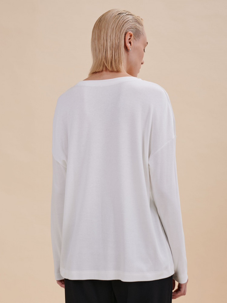 Размер свой подошёл, свободно, но не оверсайз. Комфортно и по размеру, и на ощупь. Чувствуется, со временем ткань растянется, увы. Не линяет. А на плече оказалась дырочка, заморачиваться с возвратом не буду, брала лонгслив для дома.