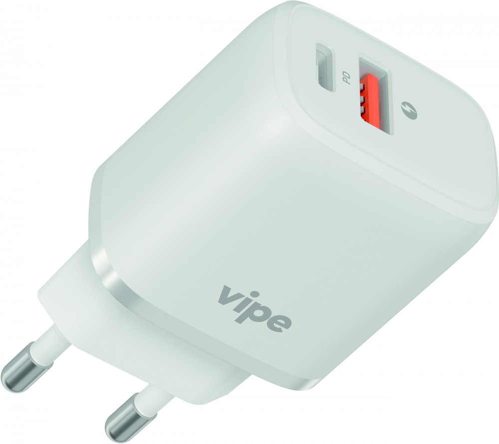 Сетевое зарядное устройство Vipe 20W — это стильное, компактное устройство, которое позволит зарядить фактически любой ваш мобильный гаджет. Модель поддерживает технологию быстрой зарядки Power Delivery(быстрая зарядка через порт Type-C), Quick Charge (быстрая зарядка). Зарядное устройство оснащено двумя разъемами Type-C и USB А. Компактный и эргономичный корпус выполнен из качественного ABS-пластика, что наделяет устройство прочностью, термостойкостью, устойчивостью к царапинам и мелким повреждениям.