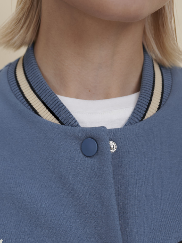 Женский бомбер в актуальном стиле преппи. Куртка комфортного объёма со спущенным плечом подарит вам комфорт и свободу движений. Обработка горловины, низа и низа рукавов из резинки в университетском стиле. Модель выполнена из гладкой и тактильно приятной ткани, которая при этом держит форму. В составе ткани преобладает высококачественный хлопок — бомбер мягкий и великолепно пропускает воздух, давая коже дышать. Благодаря эластану куртка сохраняет отличную форму в течение продолжительного времени. Жакет декорирован нашивкой и принтом по переду, а также принтом на спинке. Принты эластичные и стойкие — без проблем переносят многочисленные стирки. Можно комбинировать с любыми брюками, джинсами. Такой трикотажный бомбер можно носить на работу, учёбу, на прогулки, на отдых. Подходит для круглогодичного применения: прохладным летом, осенью, зимой, весной и демисезон.