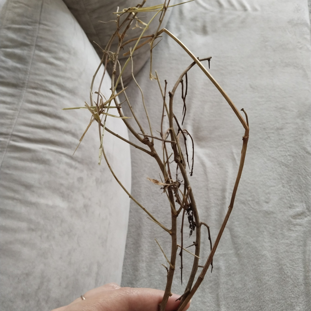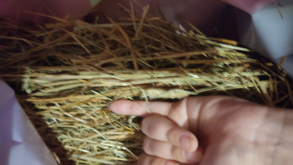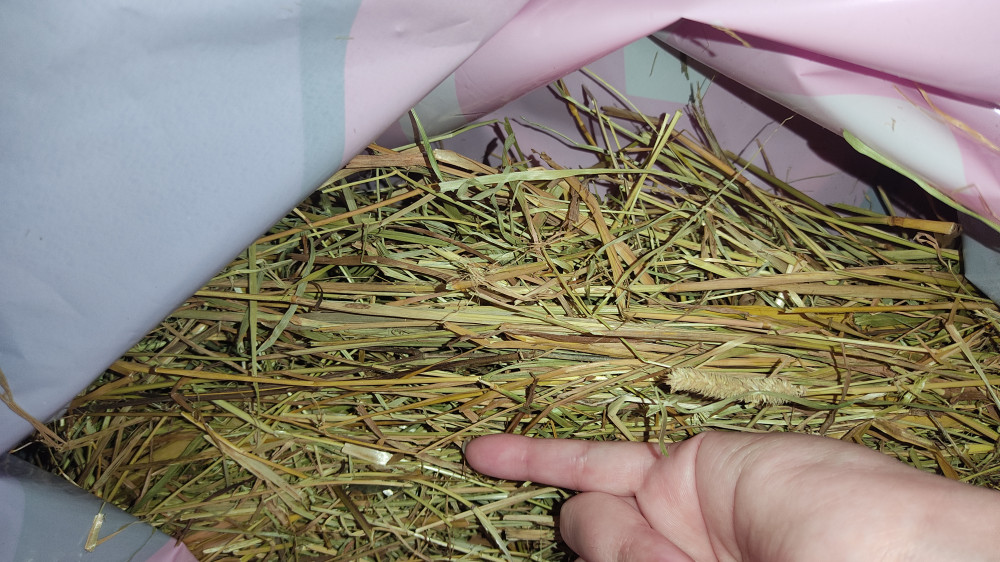 Это не сено, а солома. Сплошные пустые крупные полые стебли длиной 50см. И колоски попадаются. Сено собирается до цветения трав, а не после сбора урожая. К тому же 20 литров нет.