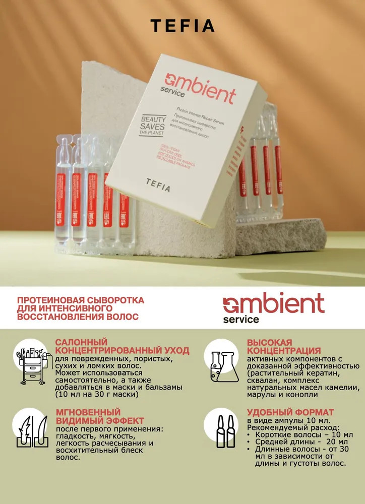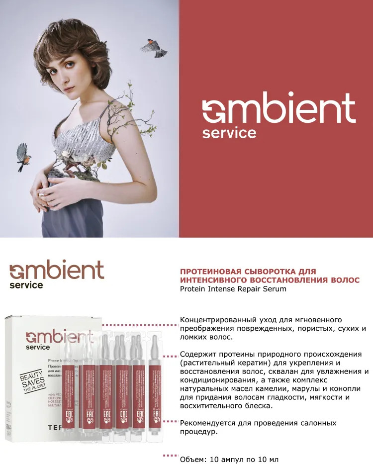 💳 Оплатить за товар можно при получении 🇰🇿 Есть бесплатная доставка по Казахстану от 1 дня 🎁 Копите бонусы с каждой покупки Серия: Ambient Service Концентрированный уход для мгновенного преображения поврежденных, пористых, сухих и ломких волос. Содержит протеины природного происхождения (растительный кератин) для укрепления и восстановления волос, сквалан для увлажнения и кондиционирования, а также комплекс натуральных масел камелии, марулы и конопли для придания волосам гладкости, мягкости и восхитительного блеска. Обеспечивает мгновенный видимый результат — плотность, гладкость, мягкость и восхитительный блеск волос. |
