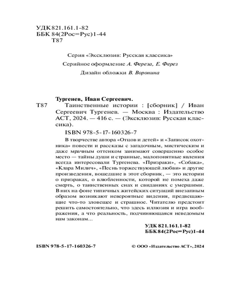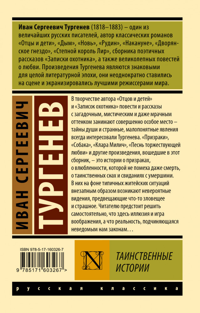 💳 Оплатить за товар можно при получении 🇰🇿 Есть бесплатная доставка по Казахстану от 1 дня 🎁 Копите бонусы с каждой покупки Серия: Эксклюзив: Русская классика В творчестве автора «Отцов и детей» и «Записок охотника» повести и рассказы с загадочным, мистическим и даже мрачным оттенком занимают совершенно особое место — тайны души и странные, малопонятные явления всегда интересовали Тургенева. «Призраки», «Собака», «Клара Милич», «Песнь торжествующей любви» и другие произведения, вошедшие в этот сборник, — это истории о призраках, о влюбленности, которой не помеха даже смерть, о таинственных снах и свиданиях с умершими. В них на фоне типичных житейских ситуаций внезапным образом возникают невероятные видения, предвещающие что-то зловещее и страшное. Читателю предстоит решить самостоятельно, что здесь иллюзия и игра воображения, а что реальность, подчиняющаяся неведомым нам законам... |