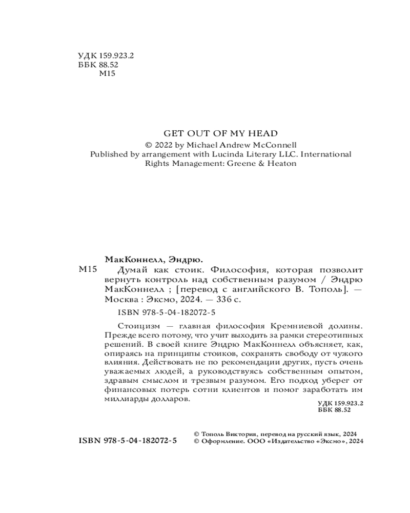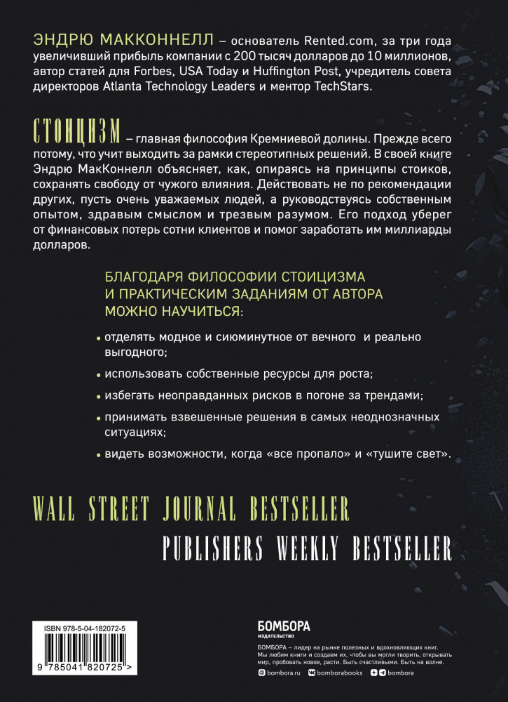 💳 Оплатить за товар можно при получении 🇰🇿 Есть бесплатная доставка по Казахстану от 1 дня 🎁 Копите бонусы с каждой покупки Серия: Хиты саморазвития Стоицизм — главная философия Кремниевой долины. Прежде всего потому, что учит выходить за рамки стереотипных решений. В своей книге Эндрю МакКонелл объясняет, как, опираясь на принципы стоиков, сохранять свободу от чужого влияния. Действовать не по рекомендации других, пусть очень уважаемых людей, а руководствуясь собственным опытом, здравым смыслом и трезвым разумом. Его подход уберег от финансовых потерь сотни клиентов и помог заработать им миллиарды долларов. |