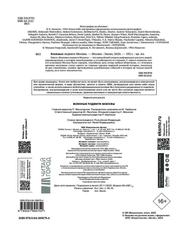 💳 Оплатить за товар можно при получении 🇰🇿 Есть бесплатная доставка по Казахстану от 1 дня 🎁 Копите бонусы с каждой покупки Серия: Подарочные издания. Россия героическая Книга «Военные подвиги Москвы» будет интересна тем, кто увлекается военной историей нашей родины. С её помощью вы сможете изучить насыщенную хронику боевой славы различных эпох из жизни столицы России. Судьбоносные войны и бунты, военные чиновники и генералы, армейские реформы и знамёна, памятные даты и имена, а также многое другое — всё это вы найдёте на страницах «Военных подвигов Москвы». Красочные иллюстрации и насыщенное датами и историческими фактами описание позволят вам погрузиться в события тех лет и не только узнать много нового и интересного, но и по-настоящему подробно изучить военную историю Москвы. |