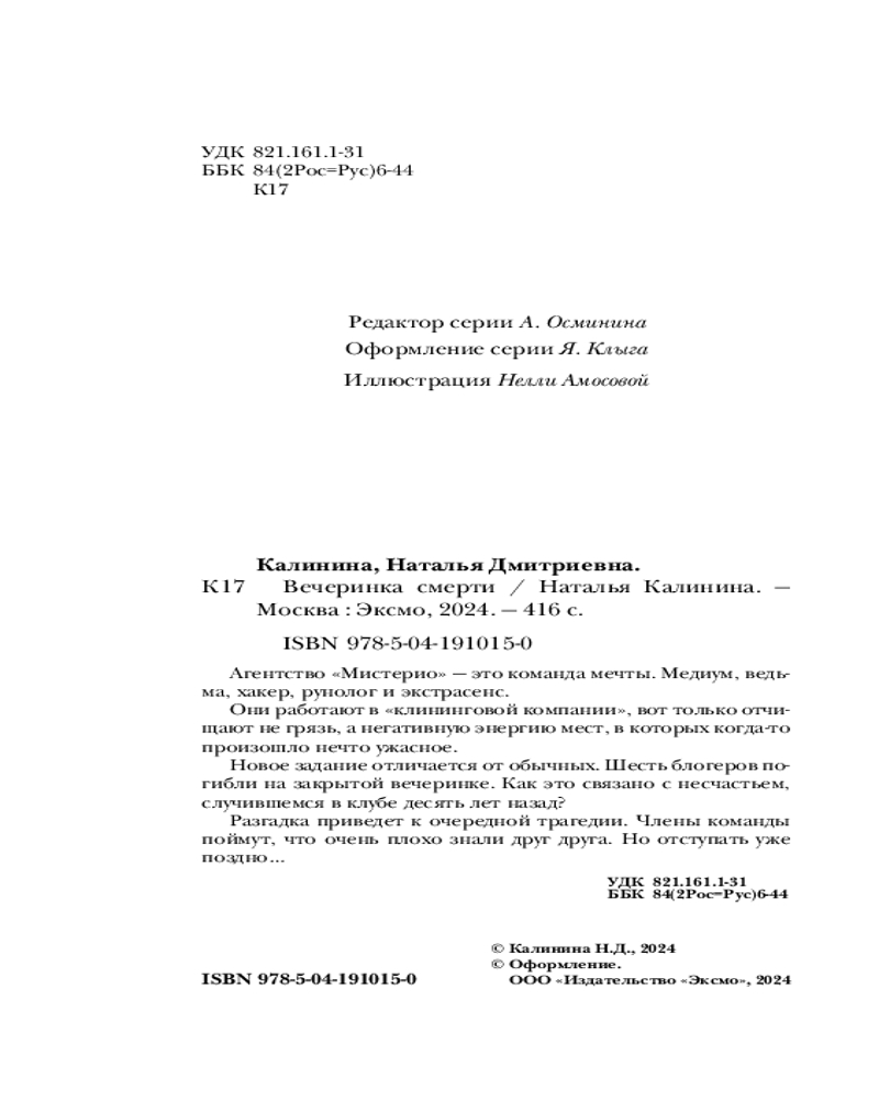 💳 Оплатить за товар можно при получении 🇰🇿 Есть бесплатная доставка по Казахстану от 1 дня 🎁 Копите бонусы с каждой покупки Серия: Агентство Мистерио. Новая серия Натальи Калининой Новый цикл известной писательницы Натальи Калининой! |