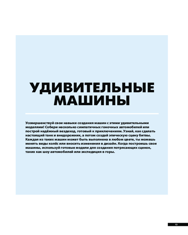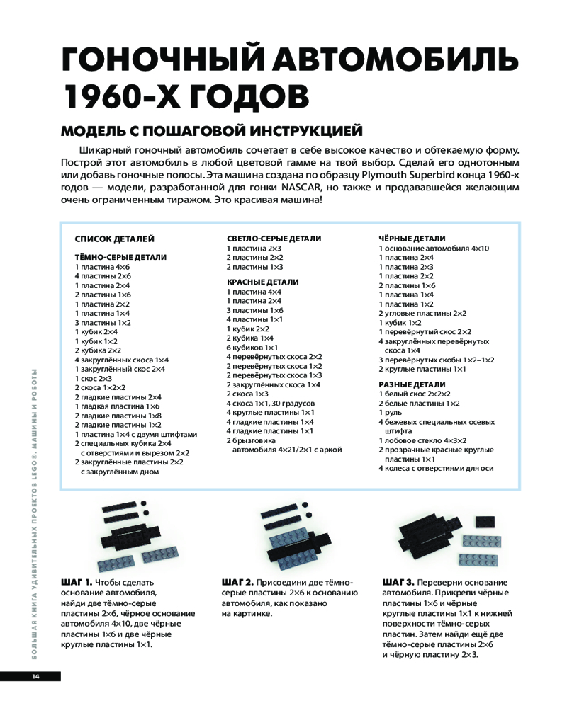 💳 Оплатить за товар можно при получении 🇰🇿 Есть бесплатная доставка по Казахстану от 1 дня 🎁 Копите бонусы с каждой покупки Серия: LEGO Книги для фанатов Приготовься создавать удивительные машины, городские сценки, и даже произведения искусства! Эта книга поможет тебе использовать своё воображение на полную мощность! В ней ты найдёшь более 30 пошаговых инструкций по сбору разнообразных фигур и сценок, но, включив фантазию, ты сможешь сделать гораздо больше! Используй схемы из книги как отправную точку для сооружения собственных уникальных моделей. Учись новым техникам конструирования, создавай свой мир Lego — и для этого у тебя наверняка есть все детали! |