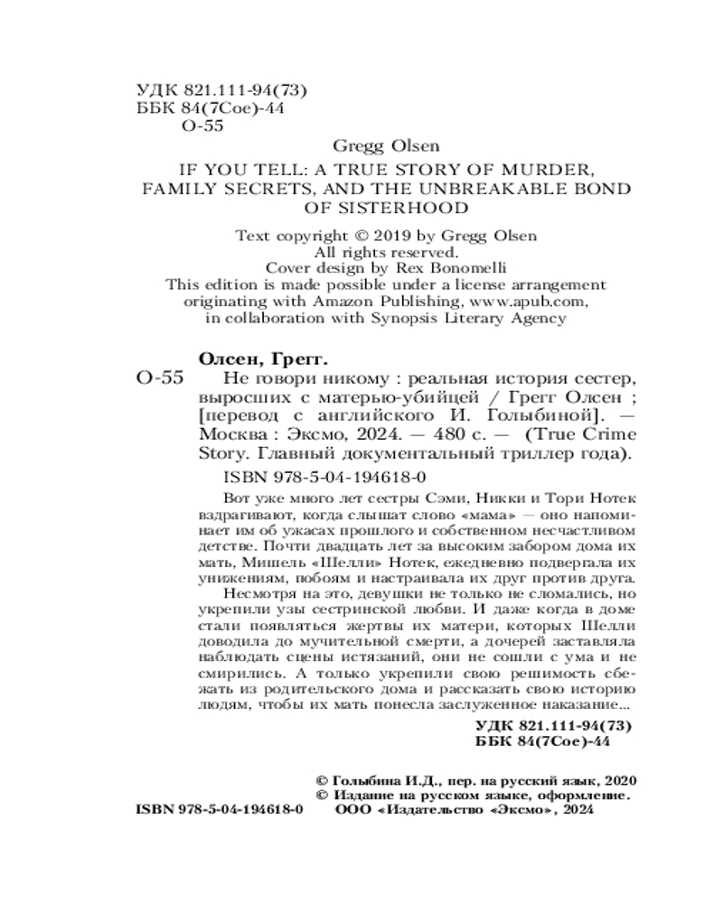💳 Оплатить за товар можно при получении 🇰🇿 Есть бесплатная доставка по Казахстану от 1 дня 🎁 Копите бонусы с каждой покупки Серия: True Crime Story. Главный документальный триллер года (обложка) Несколько лет назад к писателю true-crime книг Греггу Олсену обратились три сестры Нотек, чтобы рассказать душераздирающую историю о своей матери-садистке. Всю свою жизнь они молчали о своем страшном детстве: о сценах издевательств, пыток и убийств, которые им довелось не только увидеть в родительском доме, но и пережить самим. Сестры решили рассказать публике правду: они боятся, что их мать, выйдя из тюрьмы, снова начнет убивать... Как жить с тем, что твоя собственная мать — расчетливая психопатка, которой нравится истязать своих домочадцев, порой доводя их до мучительной смерти? Каково это — годами хранить такой секрет, который не можешь рассказать никому? И как — не озлобиться, не сойти с ума и сохранить в себе способность любить и желание жить дальше? «Не говори никому» — это психологическая триллер-сага о силе человеческого духа и мощи сестринской любви перед лицом невообразимых ужасов, страха и отчаяния. |