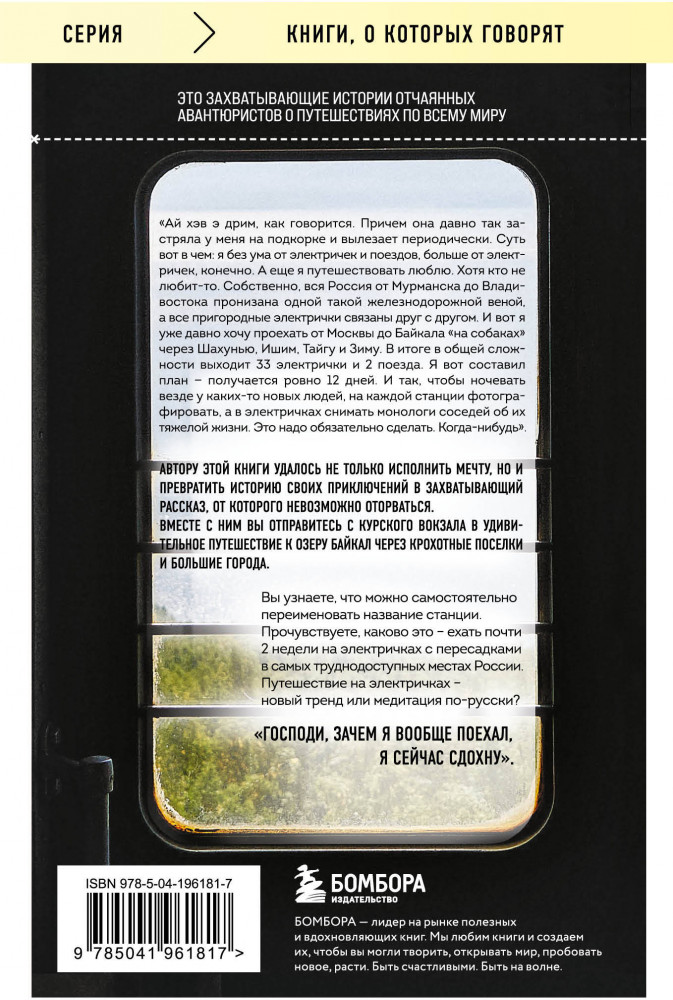 Я очень долго ждала в продаже эту книгу, не успела купить первый тираж. Нравятся книги в формате путевых дневников, путешествий (Н. Корнева мои любимые), поэтому ожидания были высокие, но не сложилось. Целый день пыталась себя заставить дочитать эту книгу, а вдруг там что-то интересное, в итоге дочитала по диагонали. Если вам интересно расписание электрочек и поездов по маршруту Москва-Байкал, то будет полезна книга. Здесь нет даже каких-то историй, зарисовок, возможно спасли бы фотографии. Только электрички сменяются одна за одной, сон, немного еда, что автор прогулялся, пару раз поработал, встретил пару друзей и всё. Целая книга максимально не содержательной безэмоциональной информации. Очень хорошая идея, название, но автор совсем не писатель и в что-то стоящее не вышло.