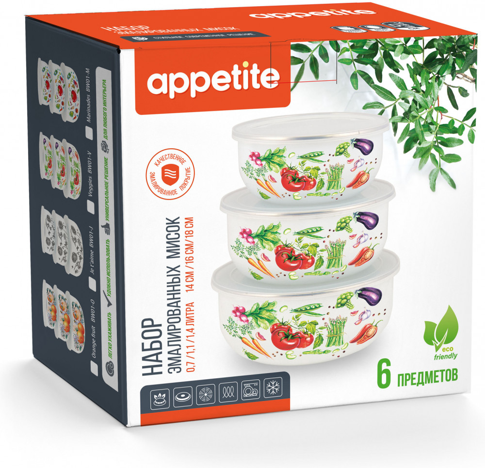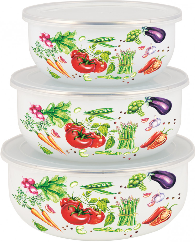 Набор мисок с крышками выполнен из стали со стеклокерамическим покрытием для гигиеничного и комфортного хранения продуктов. Делайте заготовки для салатов, храните свежие овощи, фрукты или готовые блюда. Безопасное покрытие не вступает в реакцию с пищей, не впитывает запахи и не окрашивается, надежно защищает сталь от коррозии и значительно облегчает уход за набором. Крышки для набора салатников изготовлены из безопасного пищевого пластика, плотно прилегают к корпусу салатников, предотвращают заветривание продуктов. Контейнеры складываются один в другой и занимают минимум места при хранении. Изделия можно мыть в посудомоечной машине (без пластиковой крышки), использовать в холодильнике и морозильной камере. Набор мисок прекрасно впишется в интерьер любой кухни, а уникальный авторский дизайн создаст атмосферу домашнего уюта и тепла. Посуда для кухни — очень важная составляющая, которая подарит комфорт и уют.