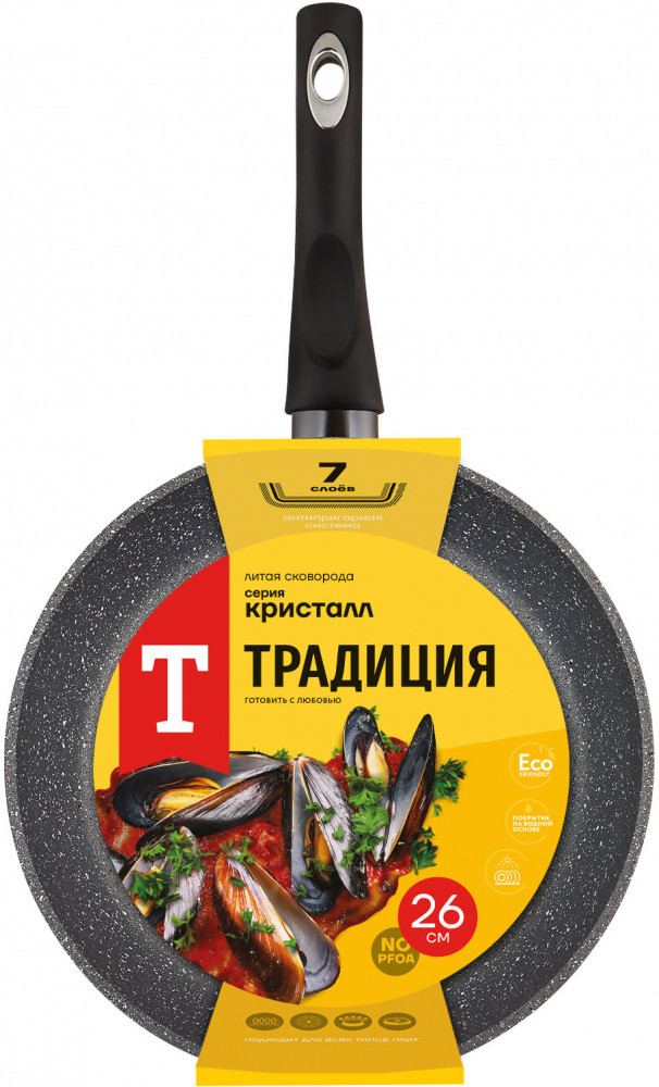 Серия «Кристалл» представлена сковородами с прочным литым корпусом, произведена российской торговой маркой посуды Традиция. Сковороды имеют каменное покрытие на водной основе, очень прочное и устойчивое к повреждениям и царапинам. Фактура натурального камня органично вписывается в дизайн помещения, и такая посуда — желанный гость на любой кухне.Каменное антипригарное покрытие безвредно, не содержит PFOA — перфтороктановой кислоты, оно сделано из натуральных минералов, не выделяющих вредных веществ. Это гарантирует приготовление здоровой пищи, позволяет безопасно жарить при высоких температурах, не выделяет опасные канцерогенные вещества. Сковороды данной серии можно использовать на всех видах плит, включая индукционные. Подходит для частого применения, идеальна для жарки и тушения, дает возможность использовать минимальное количество масла или готовить совсем без него. Можно мыть в посудомоечной машине в режиме ECO и использовать моющие средства с уровнем pH, близким к нейтральному. Усиленное 7-ми слойное антипригарное покрытие. Съемная ручка. Подходит для индукционных, стеклокерамических, газовых и электрических плит. Можно готовить без масла. Товар является экологически безопасным, т. к. при производстве не используется перфтороктановая кислота (PFOA), которая при готовке выделяет токсичные вещества в еду. Легкие царапины и небольшие потертости не ухудшают антипригарных свойств покрытия. Подходит для посудомоечной машины. Готовьте с удовольствием!