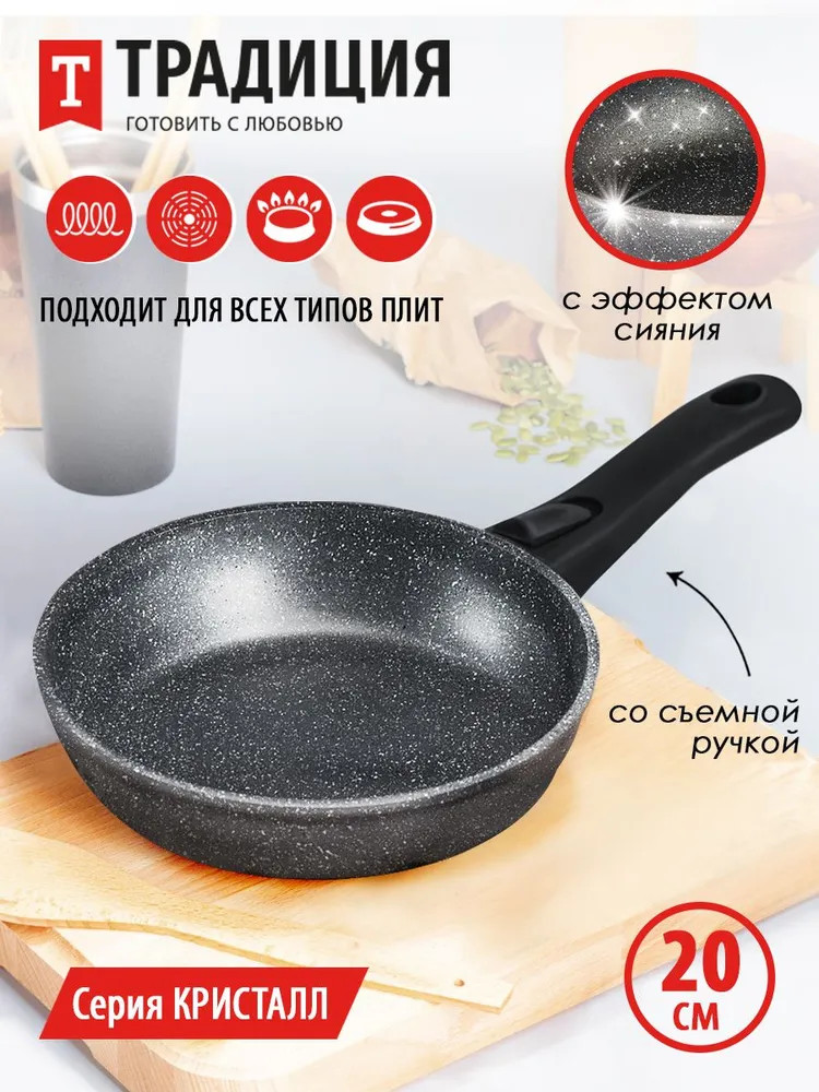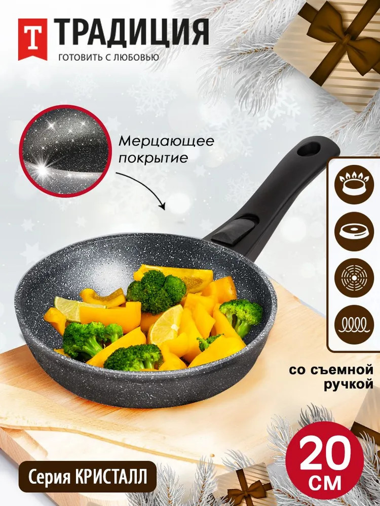 Серия «Кристалл» представлена сковородами с прочным литым корпусом, произведена российской торговой маркой посуды «Традиция». Сковороды имеют каменное покрытие на водной основе, очень прочное и устойчивое к повреждениям и царапинам. Фактура натурального камня органично вписывается в дизайн помещения, и такая посуда — желанный гость на любой кухне. Каменное антипригарное покрытие безвредно, не содержит PFOA — перфтороктановой кислоты, оно сделано из натуральных минералов, не выделяющих вредных веществ. Это гарантирует приготовление здоровой пищи, позволяет безопасно жарить при высоких температурах, не выделяет опасные канцерогенные вещества.