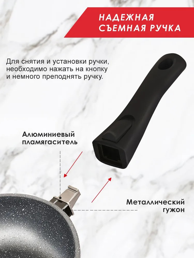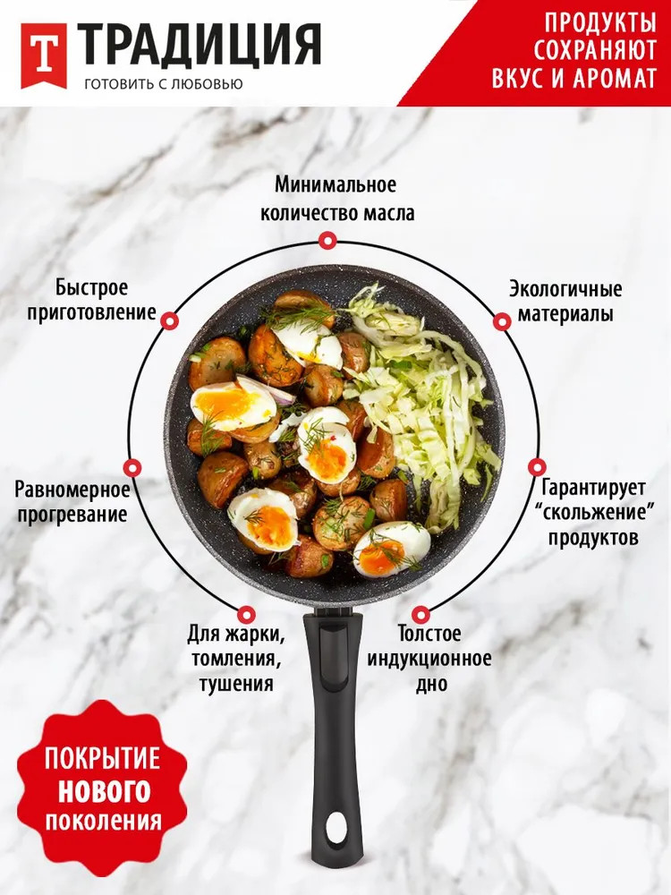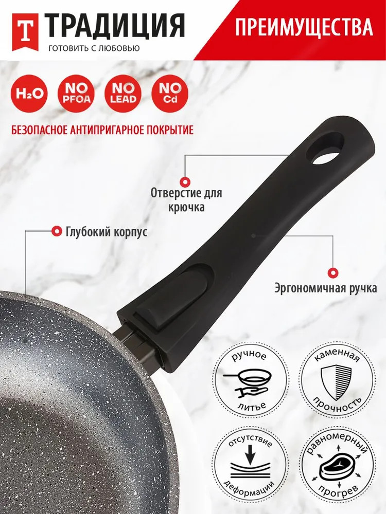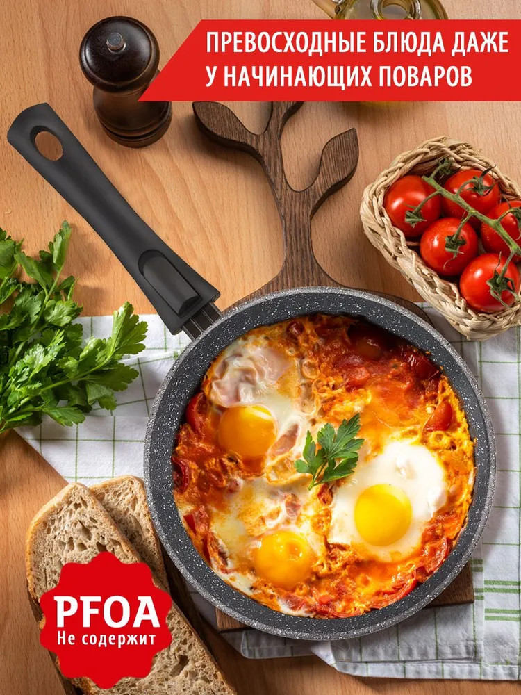 • товар является экологически безопасным, т. к. при производстве не используется перфтороктановая кислота (PFOA), которая при готовке выделяет токсичные вещества в еду;