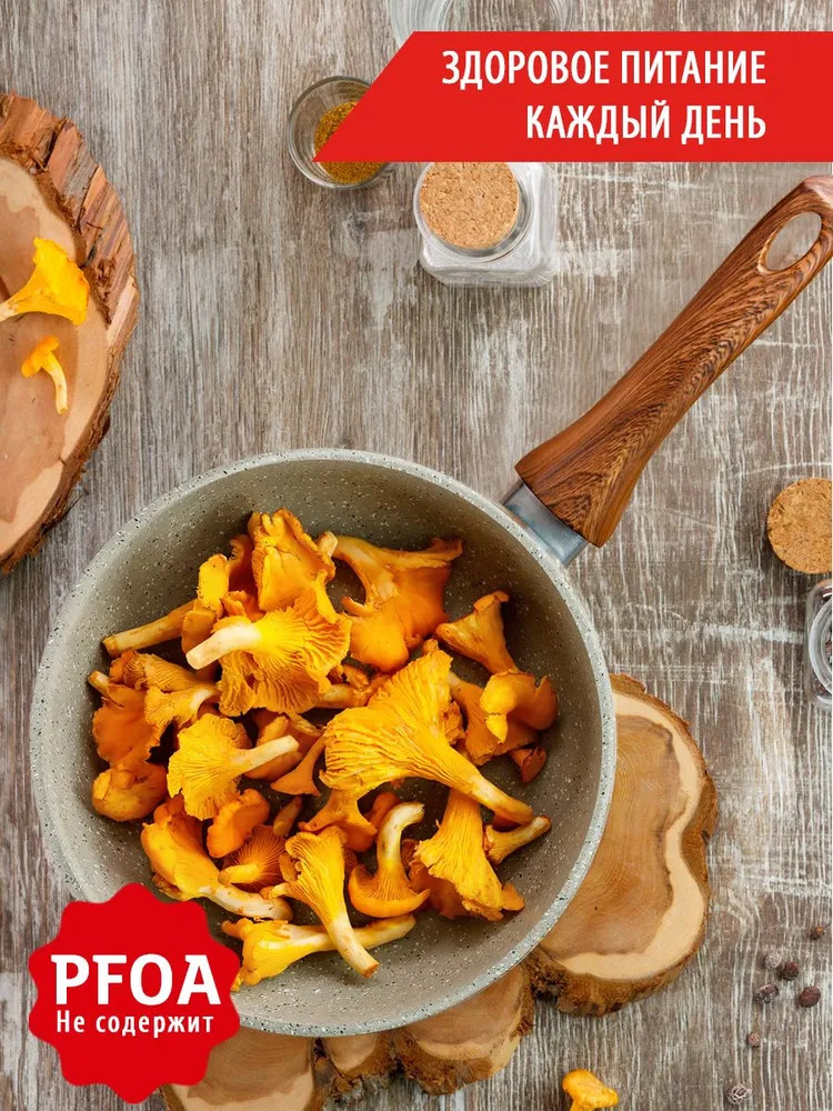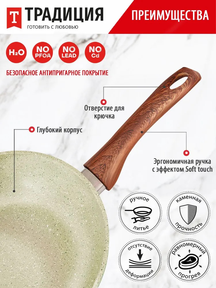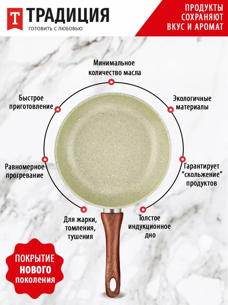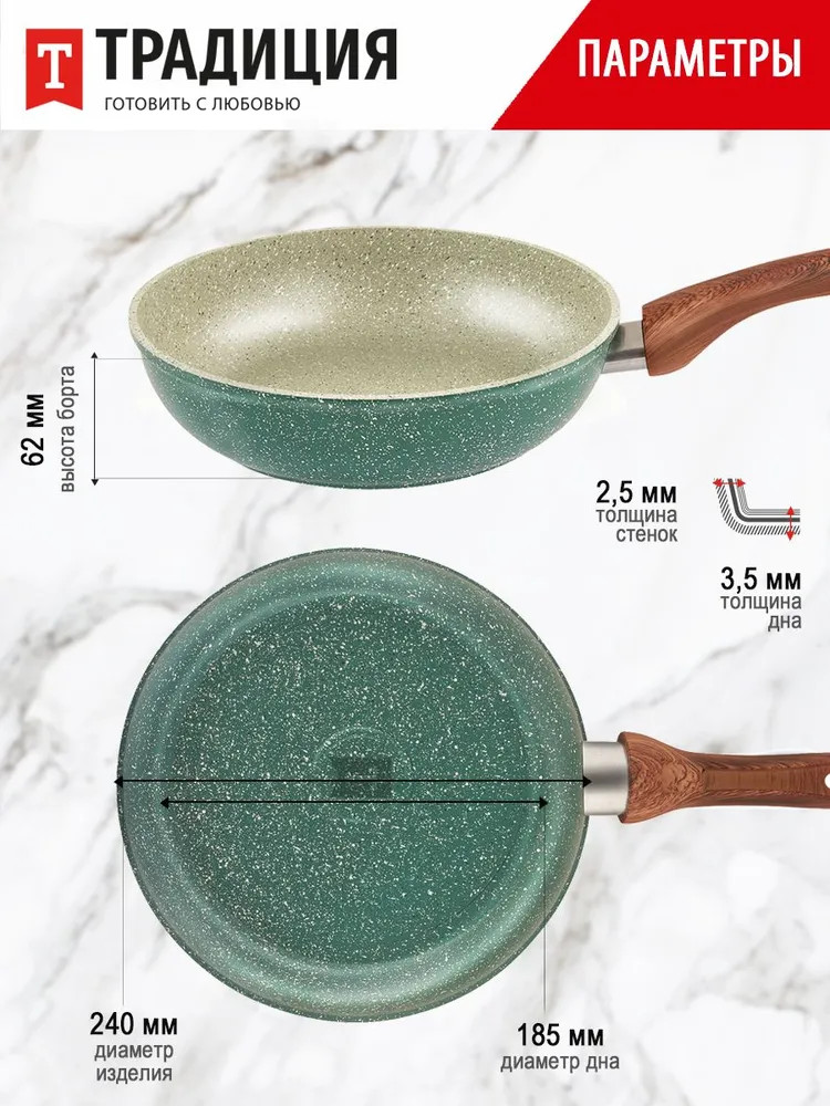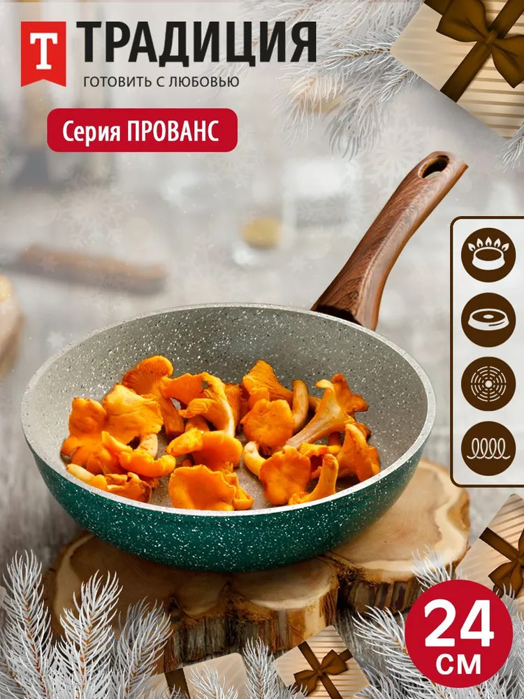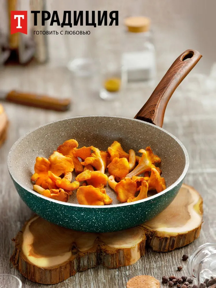 Вдохновляясь модными тенденциями и актуальными трендами в дизайне, мы создали современную линейку антипригарной посуды серии «Прованс» ТМ «Традиция». Зеленые оттенки символизируют гармонию, естественность, близость к природе. Зеленый цвет успокаивает и расслабляет, создает ощущение безопасности. В антипригарной серии посуды «Прованс» мы постарались передать природные оттенки как символ всего живого и естественного, используя теплые и холодные тона на разных сторонах изделия. Такая посуда хорошо смотрится как в классических стилях, так и в современных, сочетается с деревом и является отличным фоном для других цветов. Сковорода серии «Прованс» станет любимым предметом и самым надежным помощником на кухне, поскольку предназначена для частого использования. Толщина дна и стенок оптимальна, чтобы обеспечивать хорошую теплопроводность и равномерный нагрев, без утяжеления изделия. Многослойное антипригарное покрытие на водной основе не содержит PFOA не только безопасное, но и красивое. Посудой можно пользоваться несколько раз в день, поскольку сочетание достаточно толстого дна и современного покрытия обеспечивает более 5000 циклов приготовления. Благодаря удобной глубокой форме, она хороша для мяса, рыбы, курицы, овощей, грибов, а также блюд на основе круп. Можно готовить на всех варочных поверхностях, в том числе и индукционной. Приятным дополнением к удобному корпусу сковороды стала эргономичная ручка из термостойкого пластика с «бархатным» эффектом Soft Touch под дерево. Ручкой удобно пользоваться: она не нагревается во время приготовления и лежит в руке, не выскальзывая. За сковородой достаточно просто ухаживать вручную, а также ее можно мыть в посудомоечной машине. Соберите собственный набор сковородок Прованс любого размера. Посуда для кухни — очень важная составляющая, которая подарит комфорт и уют, а посуда для приготовления — это то, чем мы пользуется почти ежедневно.