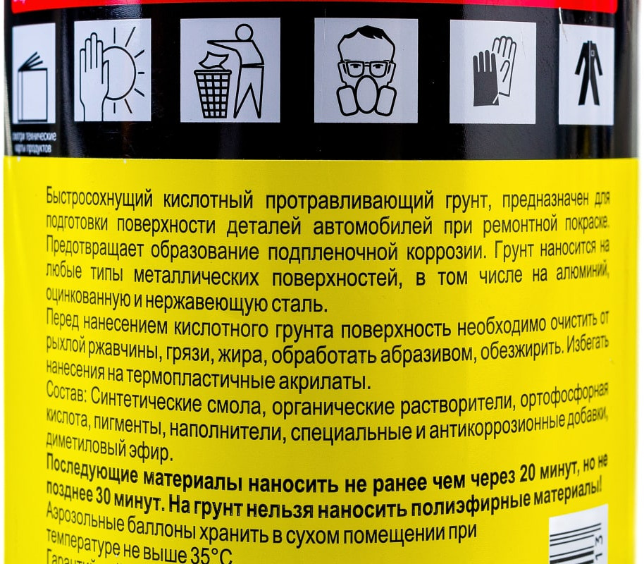 Быстросохнущий кислотный протравливающий грунт, предназначен для подготовки поверхности деталей автомобилей при ремонтной покраске. Предотвращает образование подпленочной коррозии. Повышает адгезию к различным металлам, в том числе к алюминию, оцинкованной и нержавеющей стали. Наносится на зашлифованные и обезжиренные поверхности. Рекомендуется наносить на голый металл перед применением акрилового грунта.