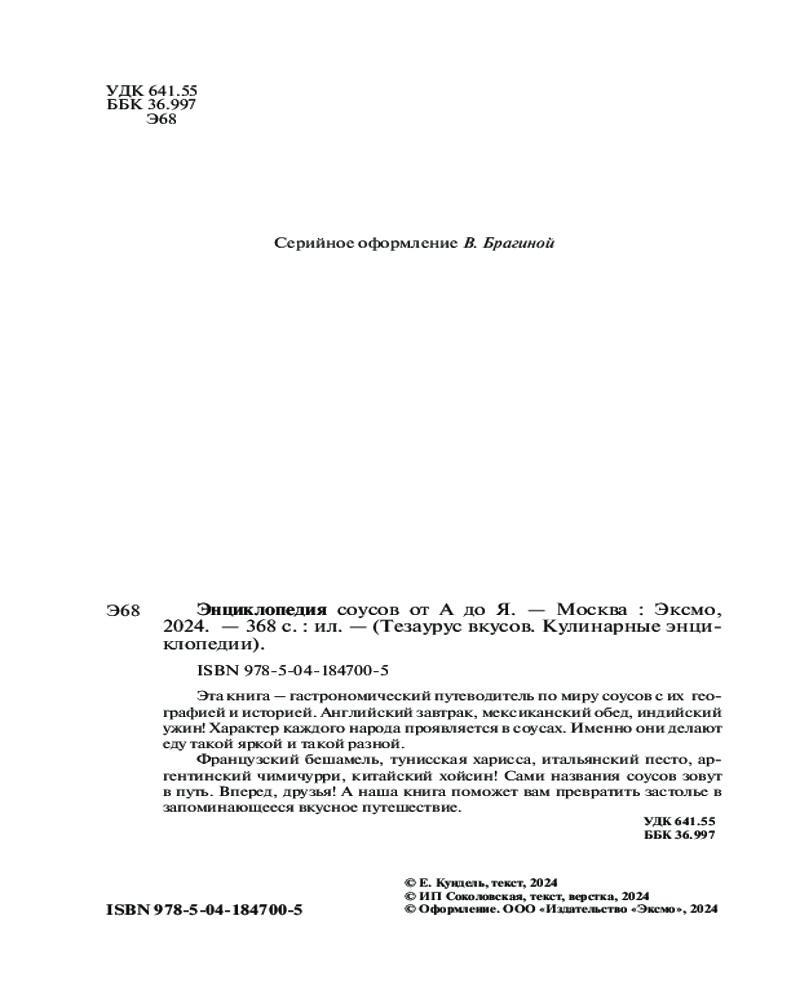 Серия: Тезаурус вкусов. Кулинарные энциклопедии Мы знаем, что соус делает любое традиционное блюдо необычным. Мы также знаем несколько соусов, которые одобрили наши родные и друзья. Но мы по-прежнему задаемся вопросом: что же такое соус и почему он так изменяет вкус блюда в лучшую сторону? Данная книга отгадывает многие загадки, касающиеся этой тайны! Какими бывают соусы по консистенции. Каковы принципы основных соусов: белого, красного, голландского, сметанного. Самая простая, но исчерпывающая классификация соусов. Материнские соусы Огюста Эскофье. Чем и из чего готовить. И, наконец, рецепты эмульгированных, томатных, сырных и сливочных, кисло-сладких соусов, из трав и барбекю-соусов, а также дипы, сальсы и дрессинги. Весь мировой опыт сосредоточен в данном издании. Подобной подробной энциклопедии соусов со множеством фактов, советов, рекомендаций не было на книжном рынке. |