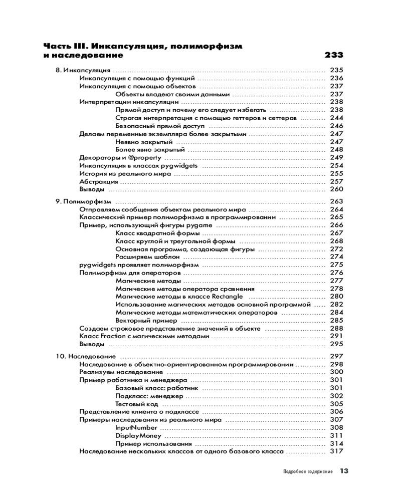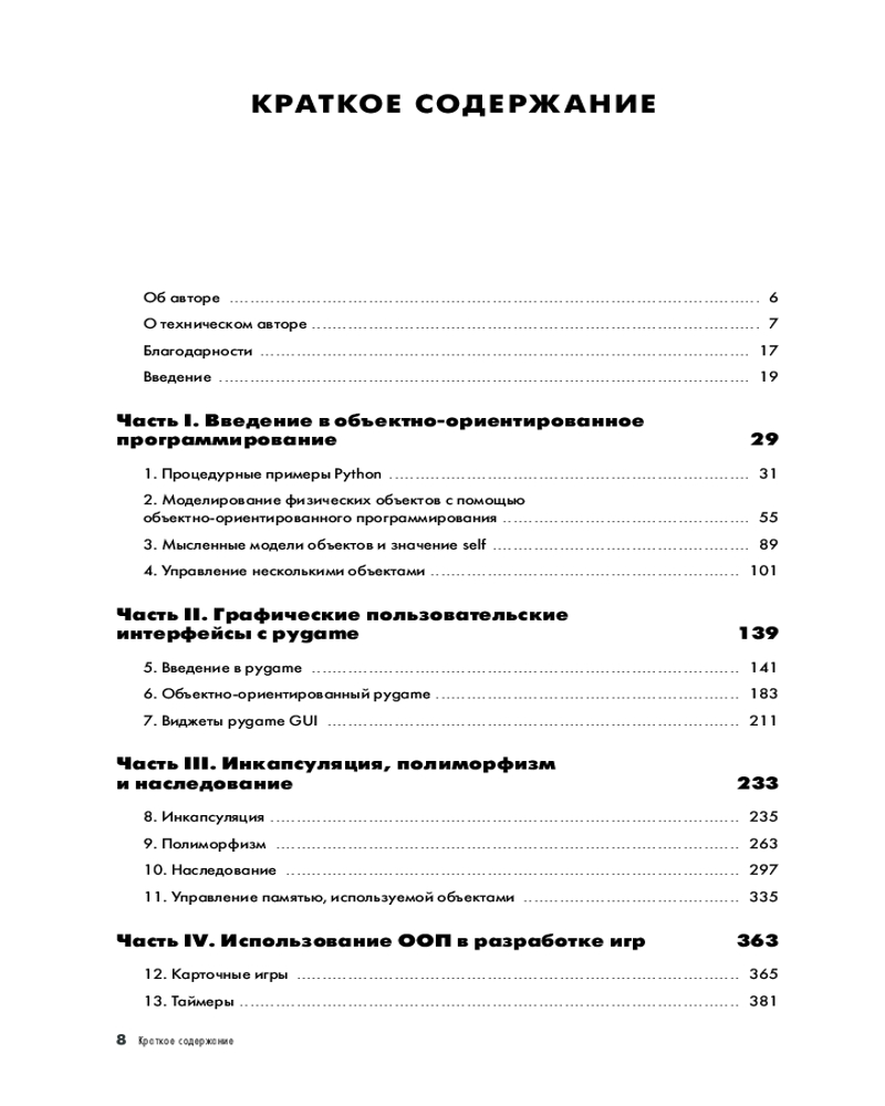 «Объектно-ориентированное программирование с помощью Python» предназначено для программистов среднего уровня и представляет собой практическое руководство, которое глубоко изучает основные принципы ООП и показывает, как использовать инкапсуляцию, полиморфизм и наследование для написания игр и приложений с использованием Python. Книга начинается с рассказа о ключевых проблемах, присущих процедурному программированию, затем вы познакомитесь с основами создания классов и объектов в Python. Затем вы научитесь создавать графические интерфейсы c помощью pygame, благодаря чему вы сможете писать интерактивные игры и приложения с виджетами графического пользовательского интерфейса (GUI), анимацией, различными сценами и многоразовой игровой логикой. В итоге у вас получится полнофункциональная видеоигра, включающая в себя многие методы ООП и элементы графического пользовательского интерфейса, описанные в книге.
