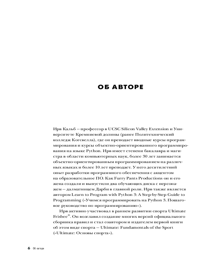 Ирв Калб — адъюнкт-профессор UCSC Silicon Valley Extension и Университета Силиконовой долины, где он преподает вводные курсы и курсы объектно-ориентированного программирования на Python. Он также автор книги «Научитесь программировать на Python 3: пошаговое руководство по программированию». |