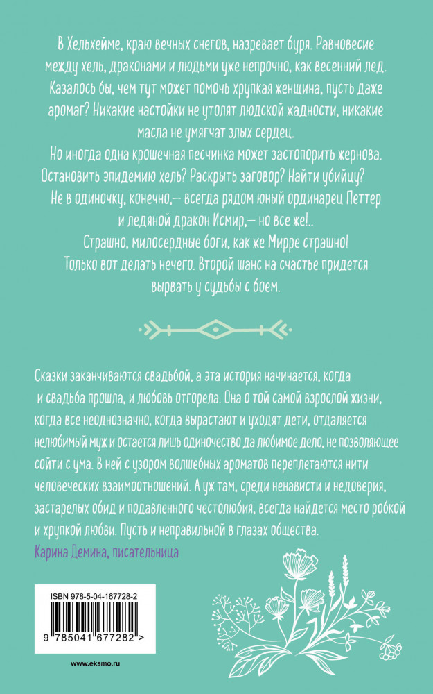 💳 Оплатить за товар можно при получении 🇰🇿 Есть бесплатная доставка по Казахстану от 1 дня 🎁 Копите бонусы с каждой покупки Серия: Защитная магия. Анна Орлова Муж давно стал для Мирры чужим и далеким. Домашний тиран, который волен заводить интрижки, запрещать жене работать и даже отослать подальше их единственного сына. Ей остается день за днем прозябать в холодном Хельхейме, находя утешение в магии трав и ароматов. Ведь Мирра творит чудеса: щепотка специй, капля эфирного масла, чуть-чуть настойки — и готовы рецепты от хворей и невзгод. Она исцеляет людей, ледяных драконов, даже великанов-хель! Вот только себе самой она помочь не в силах. Среди вечных снегов так легко замерзнуть сердцем, смириться с обстоятельствами, перестать бороться с глухой тоской. Однако привычная жизнь разлетается на осколки, когда муж Мирры ввязывается в рискованную игру... |