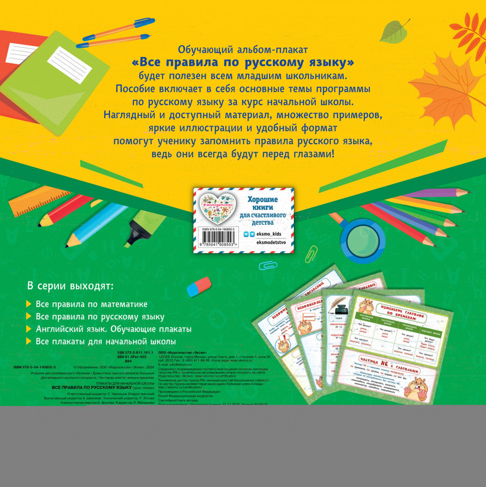 Все правила по русскому языкуВ данный момент этот товар отсутствует в продаже. Возможно, у нас найдется аналогичный или похожий товар здесь. Серия: Плакаты для начальной школы В пособии собраны все основные правила по русскому языку за курс начальной школы. Основная цель альбома-плаката — закрепление и повторение знаний, полученных на уроках русского языка. Учебный материал изложен наглядно и доступно, с применением схем и таблиц, и красочно проиллюстрирован. Благодаря этому правила и примеры их применения будут легко запоминаться. Порядок тем соответствует школьной программе 1-4 классов. Плакаты можно использовать как дома, так и в школе для лучшего усвоения и повторения учебного материала. |