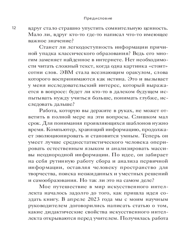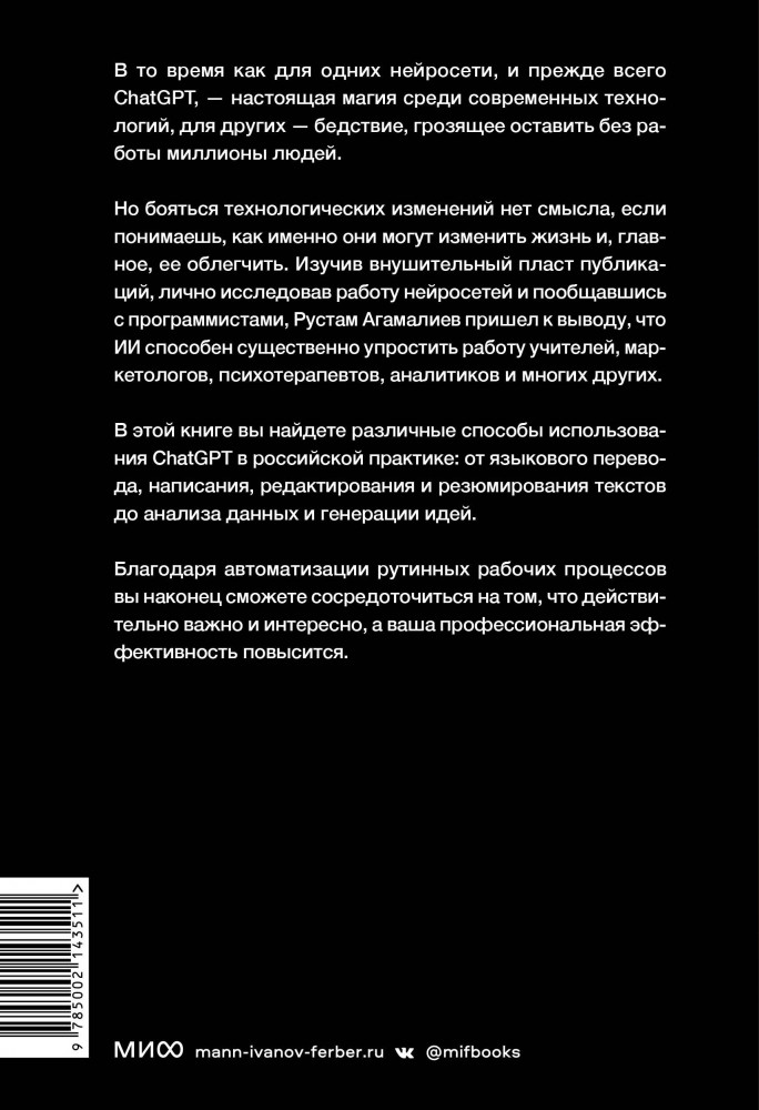 💳 Оплатить за товар можно при получении 🇰🇿 Есть бесплатная доставка по Казахстану от 1 дня 🎁 Копите бонусы с каждой покупки Комплексная и при этом доступная книга об искусственном интеллекте от российского эксперта, которая даст все необходимые знания об ИИ, включая практическое применение в различных областях. В этой книге вы найдете различные способы использования ChatGPT в российской практике: от языкового перевода, написания, редактирования и резюмирования текстов до анализа данных и генерации идей. |