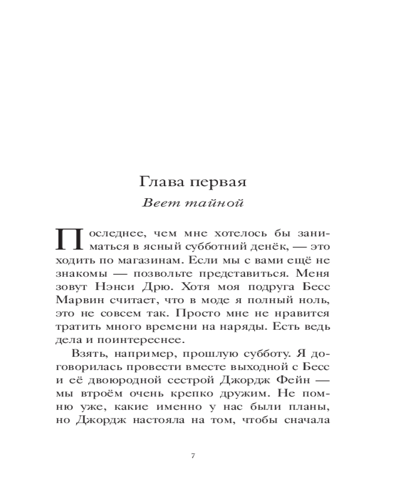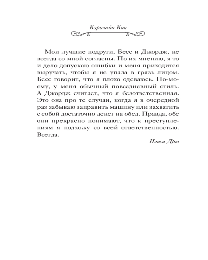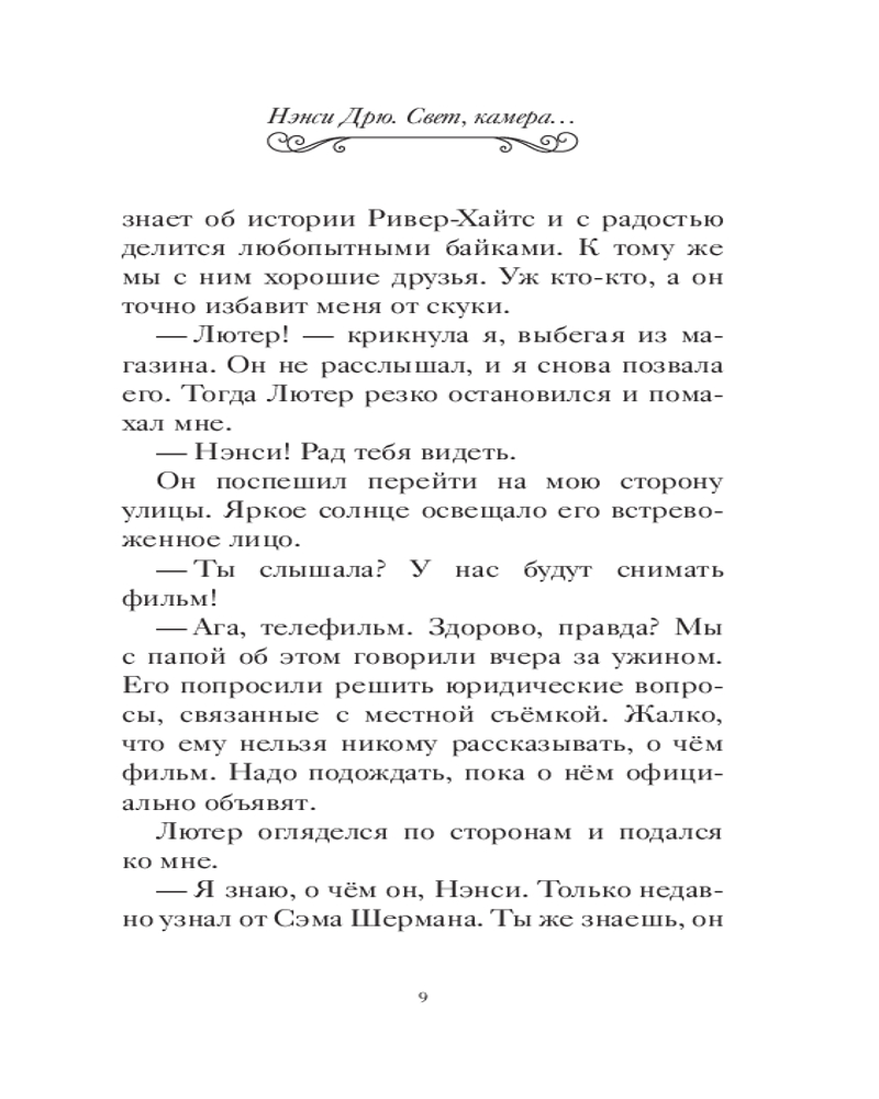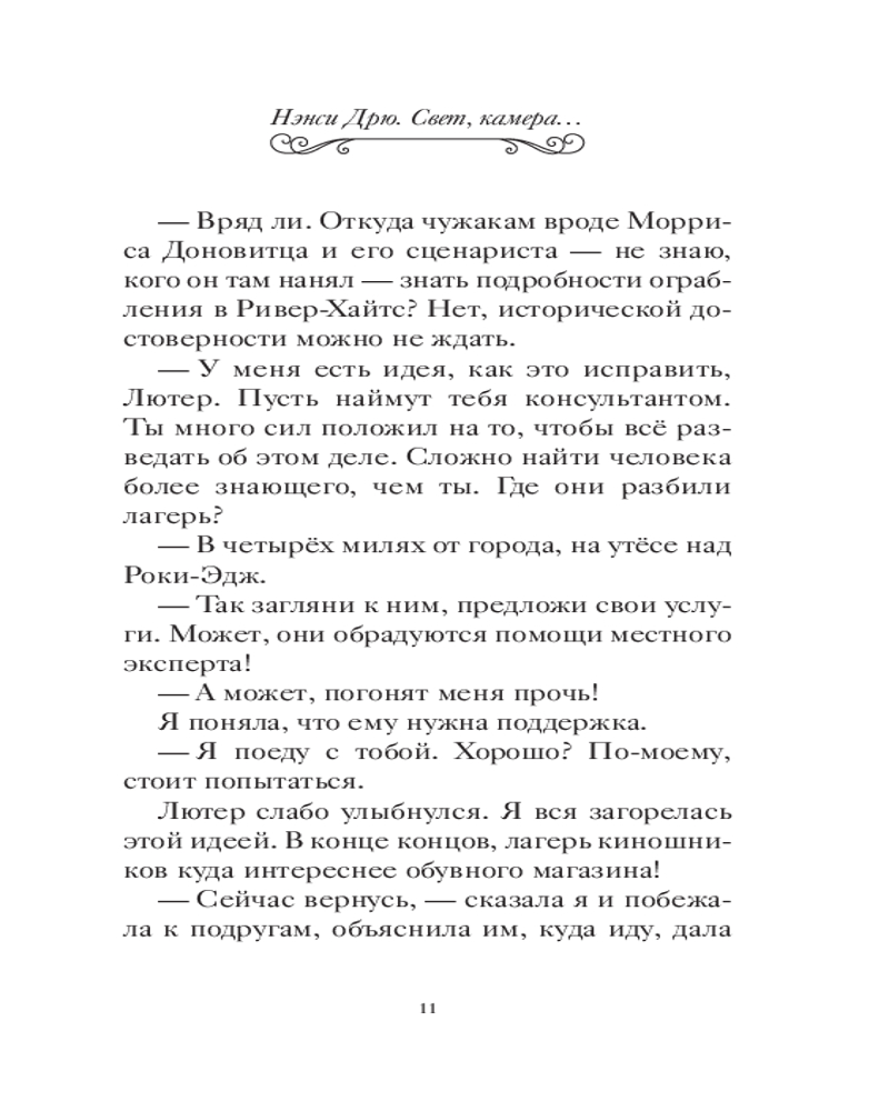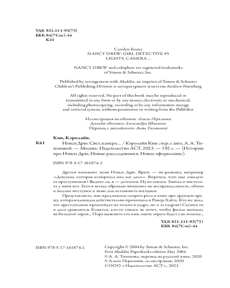 💳 Оплатить за товар можно при получении 🇰🇿 Есть бесплатная доставка по Казахстану от 1 дня 🎁 Копите бонусы с каждой покупки Серия: Истории про Нэнси Дрю. Новые расследования. Новое оформление Друзья называют меня Нэнси Дрю. Враги — по-разному, например: «Девушка, которая испортила мне все дело». Впрочем, чего еще ожидать от преступников? Видите ли, я — детектив. Ну не совсем. Значка и пистолета у меня нет. Зато я всегда обращаю внимание на несправедливость, обман и подлые поступки и знаю, как остановить негодяев. Представляете, мне предложили сыграть роль в кино про крупную кражу, которая однажды действительно произошла в Ривер-Хайтс. Кто знал, что преступление произойдет не только в кадре, но и за кадром! Съемки то и дело срываются. Кажется, кто-то совсем не хочет, чтобы фильм выходил на большой экран... Пора выяснить его имя, иначе играть будет уже некому... |