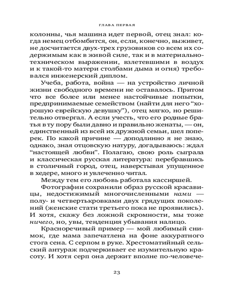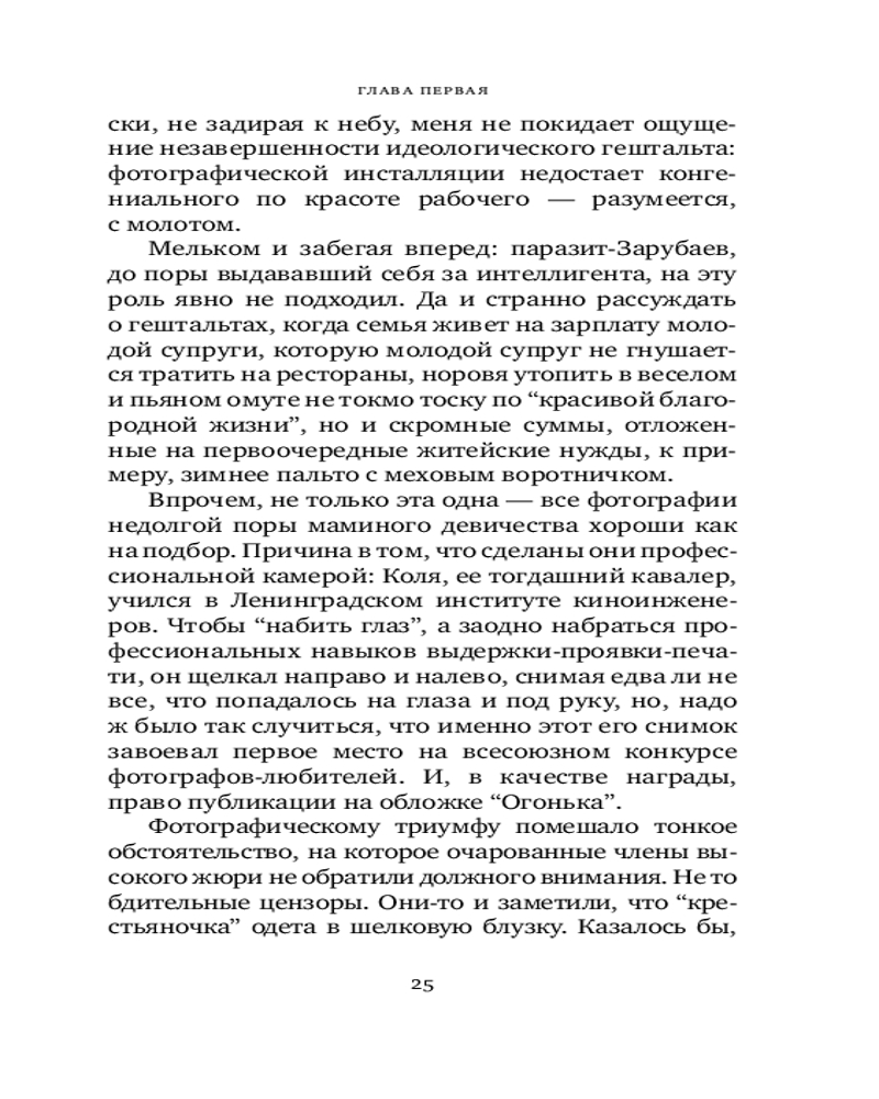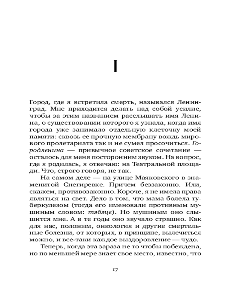 «Километров за тридцать до конечной станции мама сошла с поезда... До Ленинграда она добиралась на попутном грузовике. Одна. Дома, на 1-й Красноармейской, ее ждала пустая комната: из довоенной мебели осталась железная кровать. Впрочем, отсутствие мебели маму нимало не расстроило: главное — Ленинград. Из радостей первый дней: все говорят по-ленинградски. Это чувство языка — чистого, вновь обретенного после долгой разлуки, — осталось на всю жизнь». |