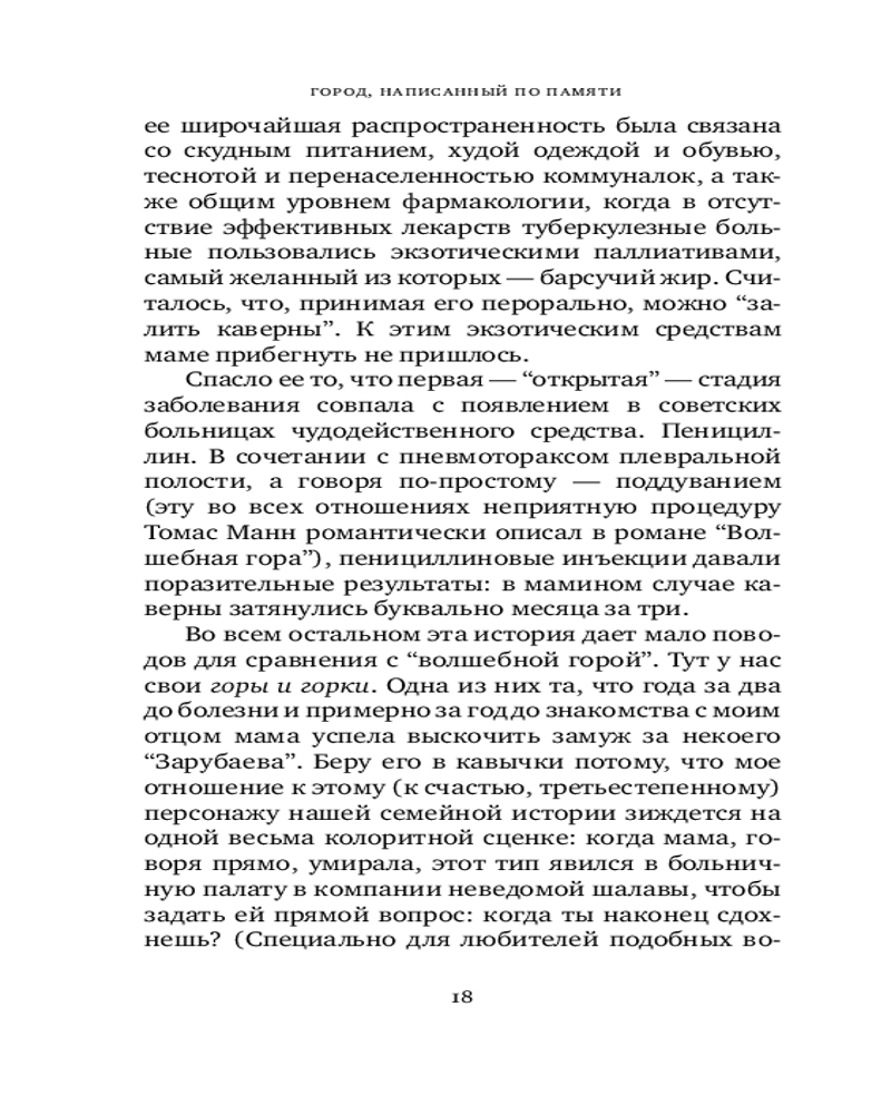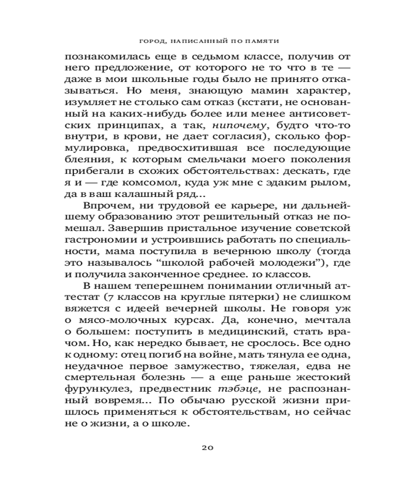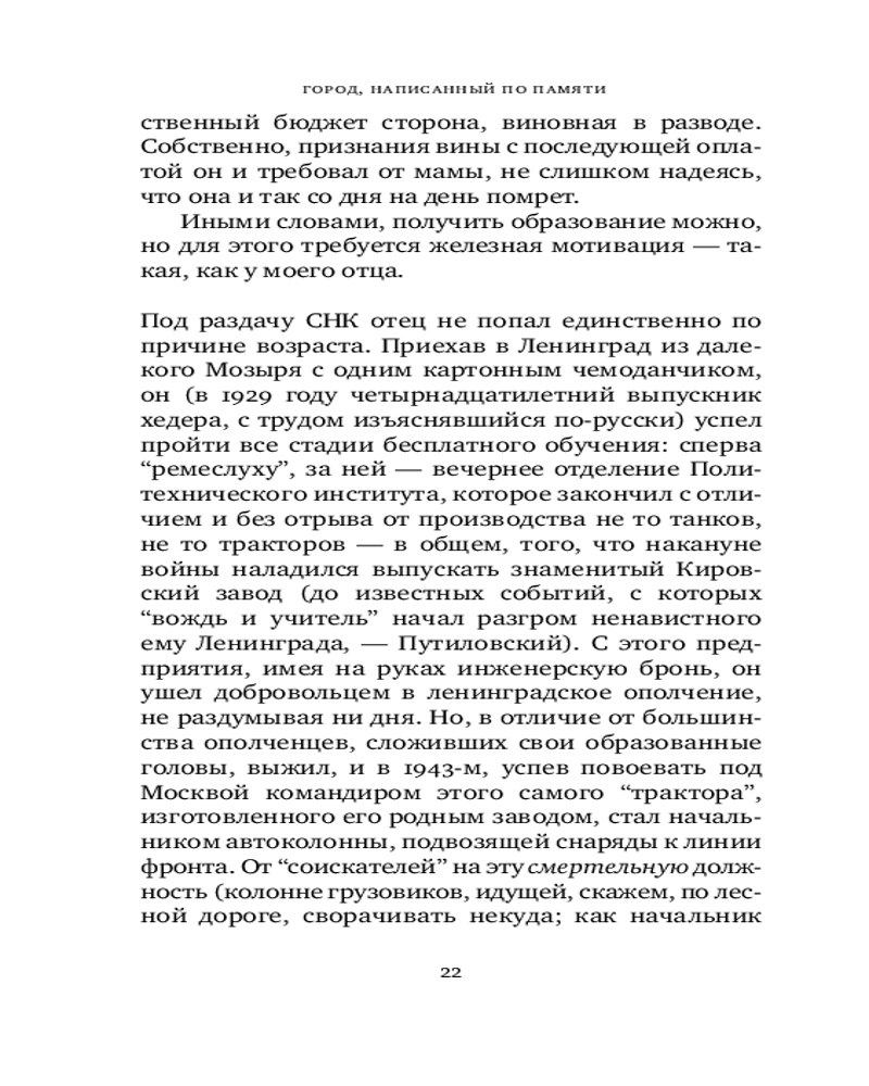 «Город, написанный по памяти» — роман-расследование, где Петербург становится городом памяти — личной, семейной, исторической. Елена Чижова по крупицам восстанавливает захватывающую историю своей семьи. Графская горничная, печной мастер, блестящая портниха, солдат, главный инженер, владелица мануфактуры и девчонка-полукровка, которая «травит рóманы» дворовым друзьям на чердаке, — четыре поколения, хранящие память о событиях ХХ века, выпавших на долю ленинградцев: Гражданская война, репрессии 1930-х годов, блокада, эвакуация, тяжкое послевоенное время.