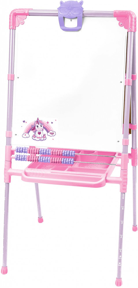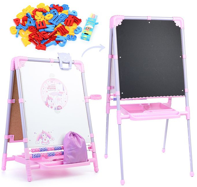 Мольберт «растущий» двусторонний предназначен для развития творческих способностей ребенка и обустройства игрового пространства в детских учреждениях и дома. Поверхность мольберта белого цвета предназначена для рисования специальным маркером для белой доски, а также для размещения магнитов; черная поверхность — для рисования мелками. Регулируется по высоте от 75,5 см до 107,5 см для удобства использования детьми разного возраста и роста. Размер рабочей поверхности: 53×46 см.